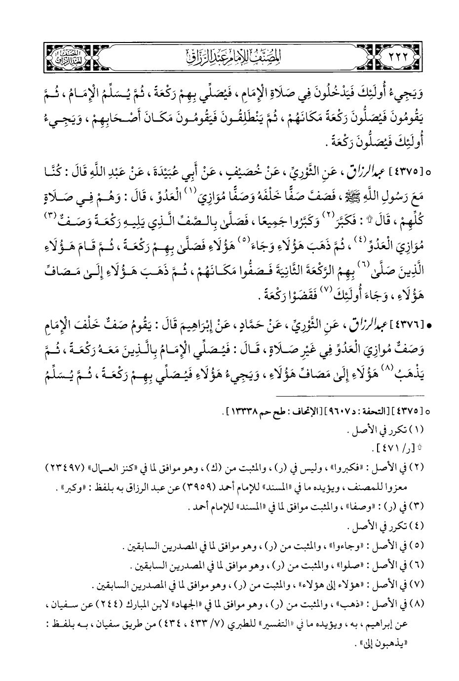 ° [٤٣٧٥] عبد الرزاق، عَنِ الثَّوْريِّ، عَنْ خُصيْفٍ، عَنْ أَبِي عُبَيْدَةَ، عَنْ عَبْدِ اللَّهِ قَالَ: كُنَّا مَعَ رَسُولِ اللَّهِ - صلى الله عليه وسلم -، فَصَفَّ صَفًّا خَلْفَهُ وَصَفًّا مُوَازِيَ (¬١) الْعَدُوِّ، قَالَ: وَهُمْ فِي صَلَاةٍ كُلِّهِمْ، قَالَ *: فَكَبَّرَ (¬٢) وَكَبَّرُوا جَمِيعًا، فَصلَّى بِالصفِّ الَّذِي يَلِيهِ رَكْعَةً وَصفٌّ (¬٣) مُوَازِيَ الْعَدُوِّ (¬٤)، ثُمَّ ذَهَبَ هَؤُلَاءِ وَجَاءَ (¬٥) هَؤُلَاءِ فَصَلَّى بِهِمْ رَكْعَةً، ثُمَّ قَامَ هَؤُلَاءِ الَّذِينَ صَلَّى (¬٦) بِهِمُ الرَّكْعَةَ الثَّانِيَةَ فَصَفُّوا مَكَانَهُمْ، ثُمَّ ذَهَبَ هَؤُلَاءِ إِلَى مَصَافِّ هَؤُلَاءِ، وَجَاءَ أُولَئِكَ (¬٧) فَقَضَوْا رَكْعَةً.