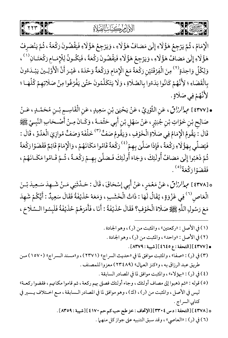 ° [٤٣٧٨] عبد الرزاق، عَنْ مَعْمَرٍ، عَنْ أَبِي إِسْحَاقَ، قَالَ: حَدَّثَنِي مَنْ شَهِدَ سَعِيدَ بْنَ الْعَاصِ (¬٦) فِي غَزْوَةٍ، يُقَالُ لَهَا: ذَاتُ الْخَشَبِ، وَمَعَهُ حُذَيْفَةُ فَقَالَ سَعِيدٌ: أَيُّكُمْ شَهِدَ مَعَ رَسُولِ اللَّهِ - صلى الله عليه وسلم - صلَاةَ الْخَوْفِ؟ فَقَالَ حُذَيْفَةُ: أَنَا، فَأَمَرَهُمْ حُذَيْفَةُ فَلَبِسُوا السِّلَاحَ،
