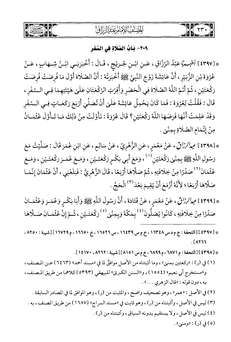 ° [٤٣٩٩] عبد الرزاق، عَنْ مَعْمَرٍ، عَنْ قَتَادَةَ، أَنَّ رَسُولَ اللَّهِ - صلى الله عليه وسلم - وَأَبَا بَكْرٍ وَعُمَرَ وَعُثْمَانَ صَدْرًا مِنْ خِلَافَتِهِ، كَانُوا يُصَلُّونَ (¬٤) بِمَكَّةَ وَبِمِنًى (¬٥) رَكْعَتَيْنِ، ثُمَّ إِنَّ عُثْمَانَ صَلَّاهَا