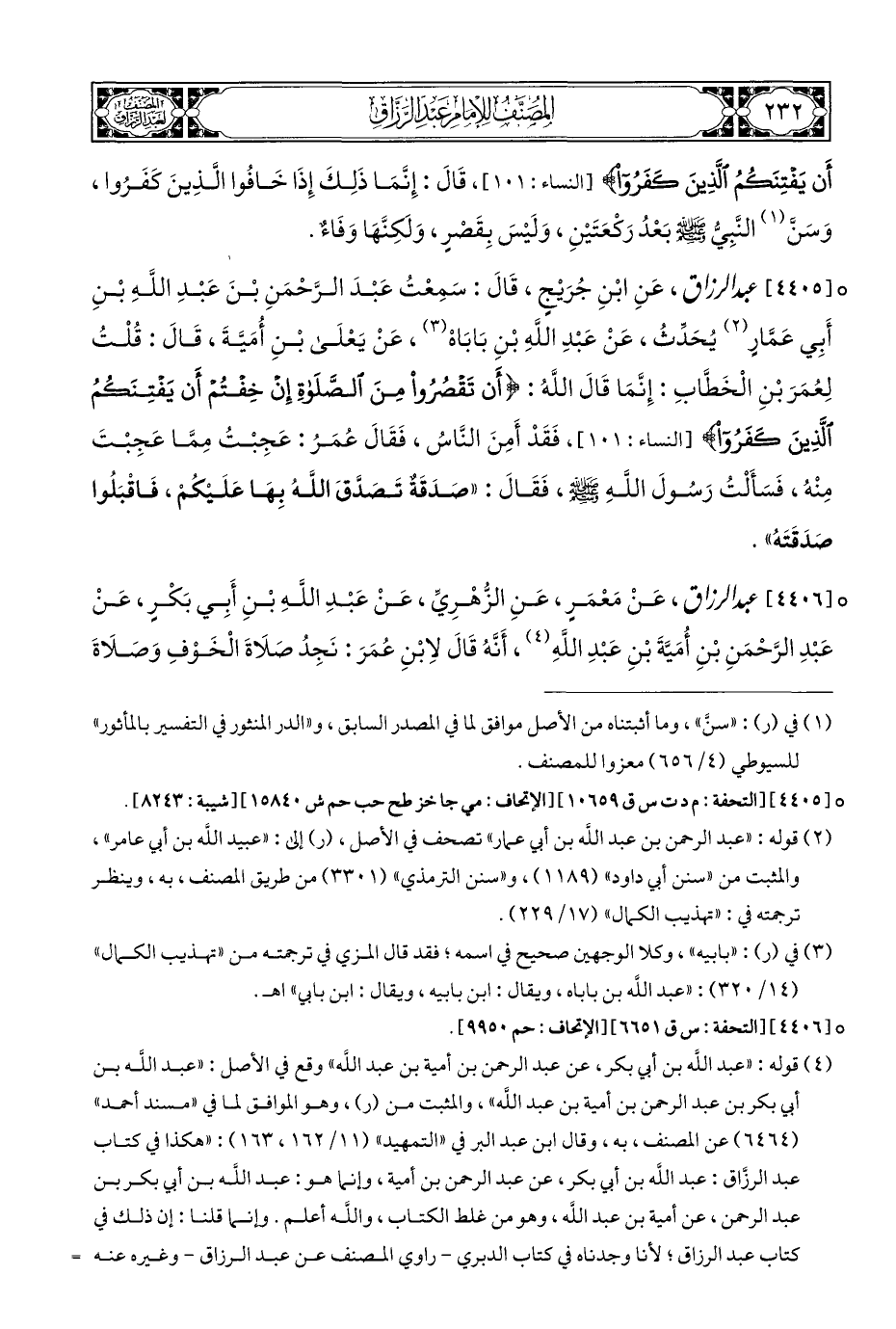° [٤٤٠٥] عبد الرزاق، عَنِ ابْنِ جُرَيْجٍ، قَالَ: سَمِعْتُ عَبْدَ الرَّحْمَنِ بْنَ عَبْدِ اللَّهِ بْنِ أَبِي عَمَّارٍ (¬٢) يُحَدِّثُ، عَنْ عَبْدِ اللَّهِ بْنِ بَابَاهْ (¬٣)، عَنْ يَعْلَى بْنِ أُمَيَّةَ، قَالَ: قُلْتُ لِعُمَرَ بْنِ الْخَطَّابِ: إِنَّمَا قَالَ اللَّهُ: {أَنْ تَقْصُرُوا مِنَ الصَّلَاةِ إِنْ خِفْتُمْ أَنْ يَفْتِنَكُمُ الَّذِينَ كَفَرُوا} [النساء: ١٠١]، فَقَدْ أَمِنَ النَّاسُ، فَقَالَ عُمَرُ: عَجِبْتُ مِمَّا عَجِبْتَ مِنْهُ، فَسَأَلْتُ رَسُولَ اللَّهِ - صلى الله عليه وسلم -، فَقَالَ: "صَدَقَةٌ تَصَدَّقَ اللَّهُ بِهَا عَلَيْكُمْ، فَاقْبَلُوا صَدَقَتَهُ".