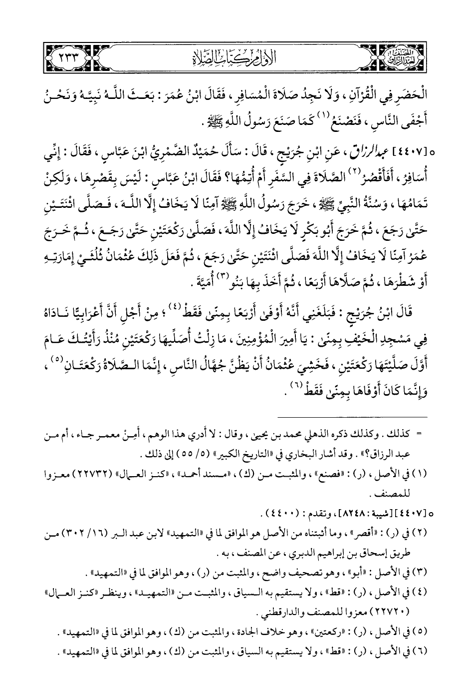 ° [٤٤٠٧] عبد الرزاق، عَنِ ابْنِ جُرَيْجٍ، قَالَ: سَأَلَ حُمَيْدٌ الضَّمْرِيُّ ابْنَ عَبَّاس، فَقَالَ: إِنِّي أُسَافِرُ، أَفَأَقْصُرُ (¬٢) الصِّلَاةَ فِي السَّفَرِ أَمْ أُتِمُّهَا؟ فَقَالَ ابْنُ عَبَّاسٍ: لَيْسَ بِقَصْرِهَا، وَلكنْ تَمَامُهَا، وَسُنَّةُ النَّبِيِّ - صلى الله عليه وسلم -، خَرَجَ رَسُولُ اللَّهِ - صلى الله عليه وسلم - آمِنًا لَا يَخَافُ إِلَّا اللَّهَ، فَصَلَّى اثْنَتَيْنِ حَتَّى رَجَعَ، ثُمَّ خَرَجَ أَبُو بَكْرٍ لَا يَخَافُ إِلَّا اللَّهَ، فَصَلَّى رَكْعَتَيْنِ حَتَّى رَجَع، ثُمَّ خَرَجَ عُمَرُ آمِنًا لَا يَخَافُ إِلَّا اللَّهَ فَصَلَّى اثْنَتَيْنِ حَتَّى رَجَعَ، ثُمَّ فَعَلَ ذَلِكَ عُثْمَانُ ثُلُثَي إِمَارَتِهِ أَوْ شَطْرَهَا، ثُمَّ صَلَّاهَا أَرْبَعًا، ثُمَّ أَخَذَ بِهَا بَنُو (¬٣) أمَيَّةَ.