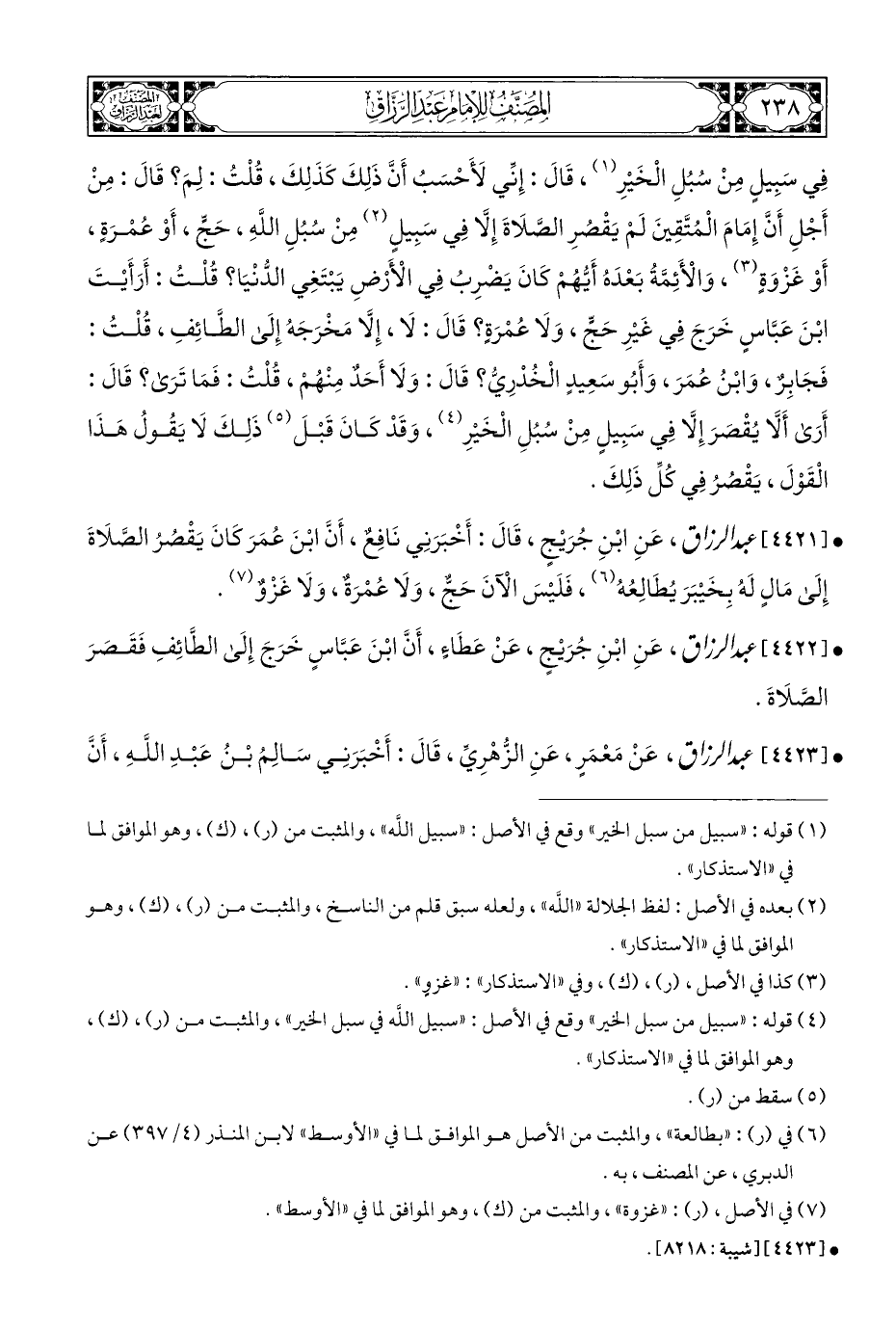 • [٤٤٢١] عبد الرزاق، عَنِ ابْنِ جُرَيْجٍ، قَالَ: أَخْبَرَنِي نَافِعٌ، أَنَّ ابْنَ عُمَرَ كَانَ يَقْصُرُ الصَّلَاةَ إِلَى مَالٍ لَهُ بِخَيْبَرَ يُطَالِعُهُ (¬٦)، فَلَيْسَ الْآنَ حَجٌّ، وَلَا عُمْرَةٌ، وَلَا غَزْوٌ (¬٧).