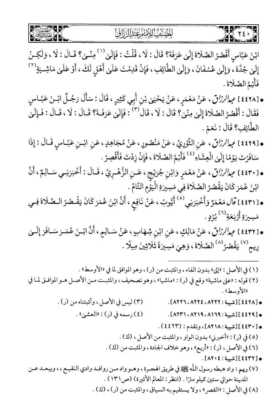 • [٤٤٣٢] عبد الرزاق، عَنْ مَالِكٍ، عَنِ ابْنِ شِهَابٍ، عَنْ سَالِمٍ، أَنَّ ابْنَ عُمَرَ سَافَرَ إِلَى رِيمٍ (¬٧) يَقصُرُ (¬٨) الصَّلَاةَ، وَهِيَ مَسِيرَةُ ثَلاثِينَ مِيلًا.