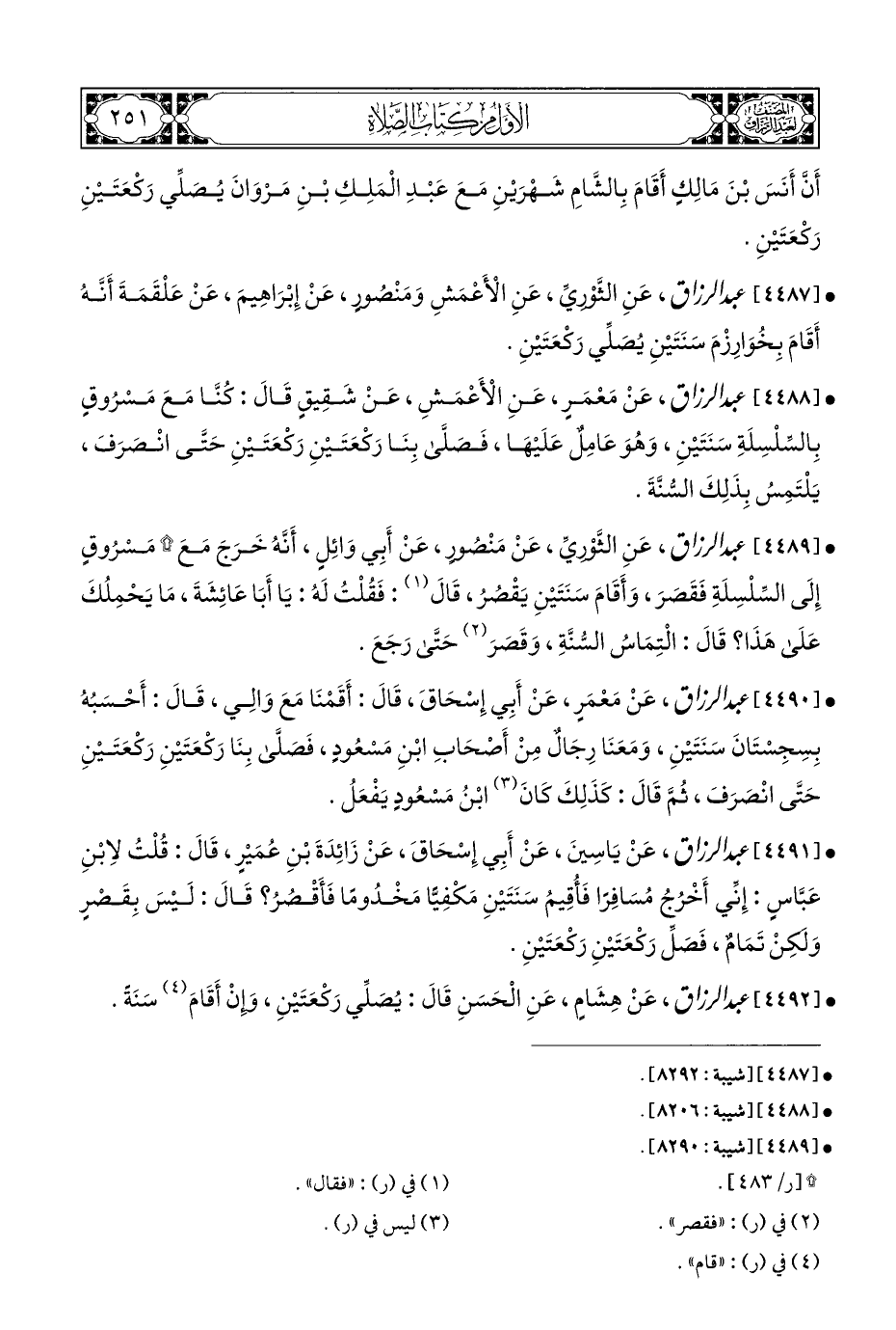 • [٤٤٩٠] عبد الرزاق، عَنْ مَعْمَرٍ، عَنْ أَبِي إِسْحَاقَ، قَالَ: أَقَمْنَا مَعَ وَالِي، قَالَ: أَحْسَبُهُ بِسِجِسْتَانَ سَنَتَيْنِ، وَمَعَنَا رِجَالٌ مِنْ أَصْحَابِ ابْنِ مَسْعُودٍ، فَصَلَّى بِنَا رَكْعَتَيْنِ رَكْعَتَيْنِ حَتَّى انْصَرَفَ، ثُمَّ قَالَ: كَذَلِكَ كَانَ (¬٣) ابْنُ مَسْعُودٍ يَفْعَلُ.