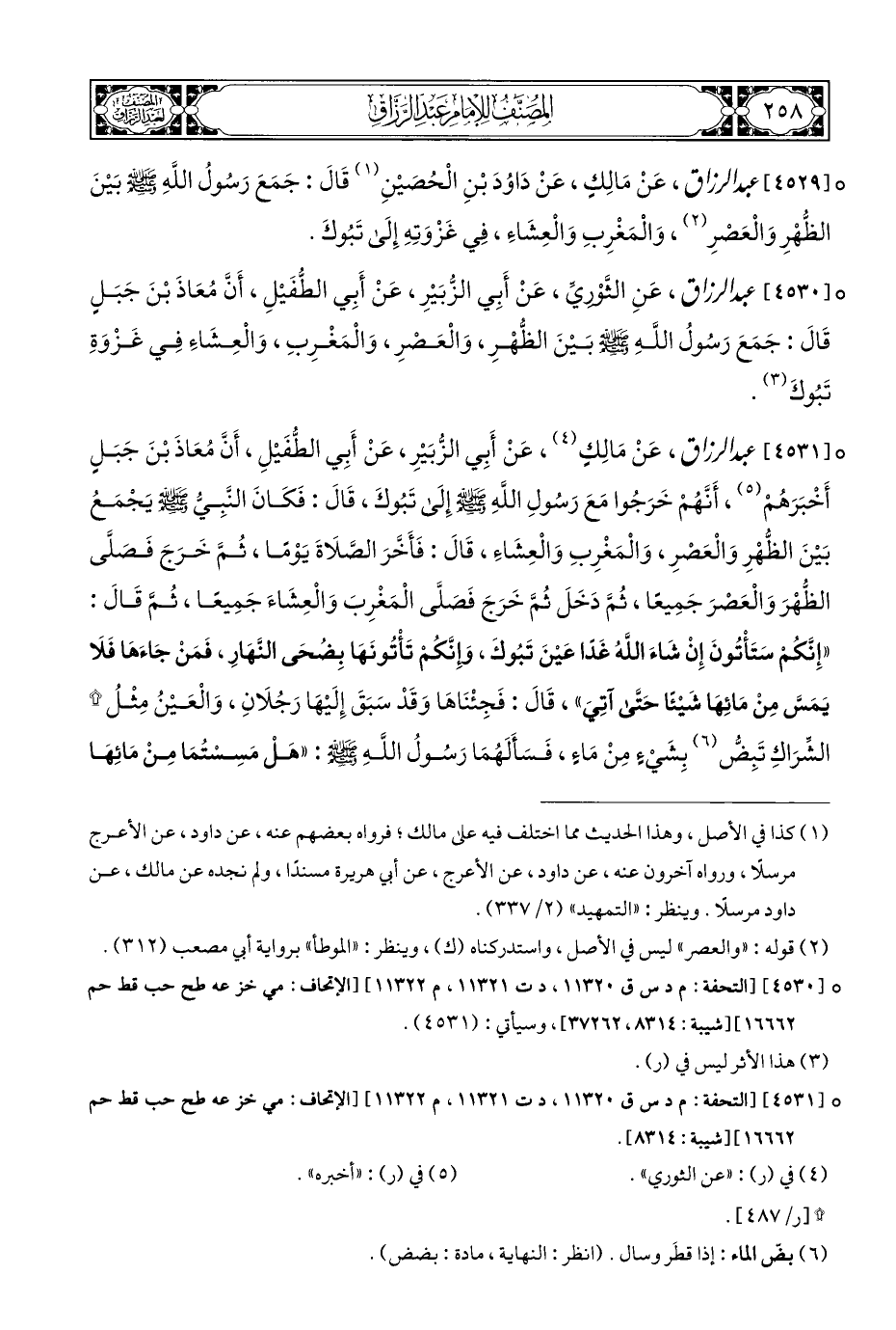 ° [٤٥٣٠] عبد الرزاق، عَنِ الثُّوْريِّ، عَنْ أَبِي الزُّبَيْرِ، عَنْ أَبِي الطُّفَيْلِ، أَنَّ مُعَاذَ بْنَ جَبَلٍ قَالَ: جَمَعَ رَسُولُ اللَّهِ - صلى الله عليه وسلم - بَيْنَ الظُّهْرِ، وَالْعَصْرِ، وَالْمَغْرِبِ، وَالْعِشَاءِ فِي غَزْوَةِ تَبُوكَ (¬٣).