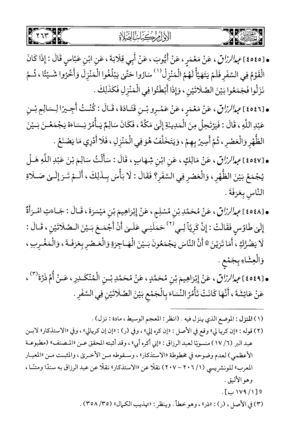 • [٤٥٤٥] عبد الرزاق، عَنْ مَعْمَرٍ، عَنْ أَيُّوبَ، عَنْ أَبِي قِلَابَةَ، عَنِ ابْنِ عَبَّاسٍ قَالَ: إِذَا كَانَ الْقَوْمُ فِي السَّفَرِ فَلَمْ يَتَهَيَّأْ لَهُمُ الْمَنْزِلُ (¬١) سَارُوا حَتَّى يَبْلُغُوا الْمَنْزِلَ وَأَخَّرُوا شَيْئًا، ثُمَّ نَزَلُوا فَجَمَعُوا بَيْنَ الصَّلَاتَيْنِ، وإِذَا أَبْطَئُوا فِي الْمَنْزِلِ فَكَذَلِكَ.