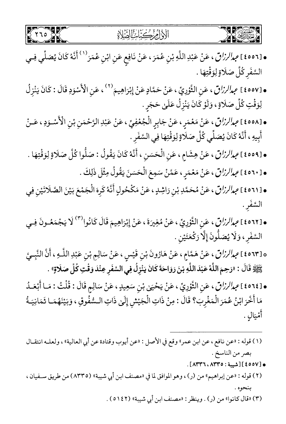 • [٤٥٦٢] عبد الرزاق، عَنِ الثَّوْريِّ، عَنْ مُغِيرَةَ، عَنْ إِبْرَاهِيمَ قَالَ كَانُوا (¬٣) لَا يَجْمَعُونَ فِي السَّفَرِ، وَلَا يُصَلُّونَ إِلَّا رَكْعَتَيْنِ.