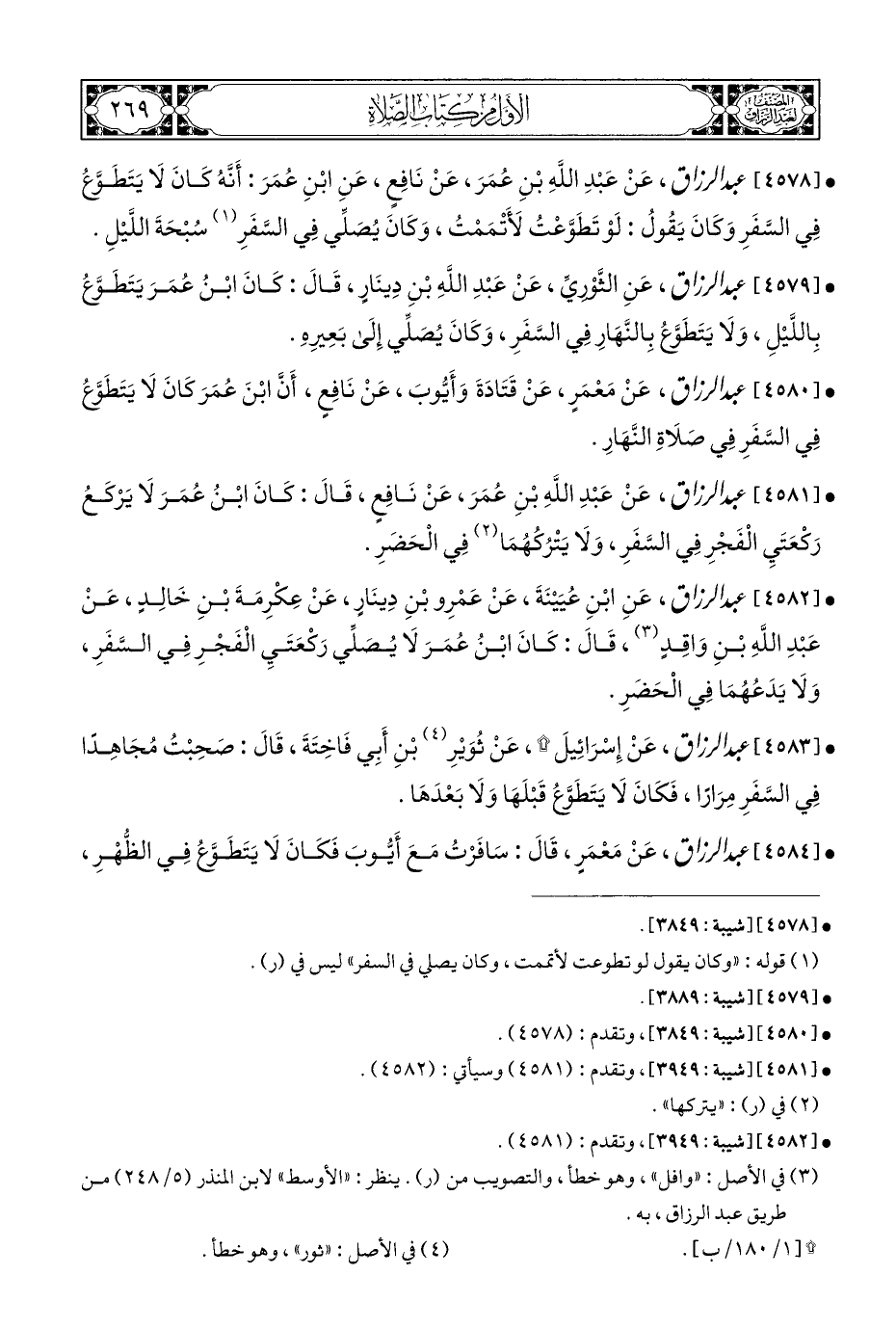 • [٤٥٨١] عبد الرزاق، عَنْ عَبْدِ اللَّهِ بْنِ عُمَرَ، عَنْ نَافِعٍ، قَالَ: كَانَ ابْنُ عُمَرَ لَا يَرْكَعُ رَكْعَتَيِ الْفَجْرِ فِي السَّفَرِ، وَلَا يَتْرُكُهُمَا (¬٢) فِي الْحَضَرِ.