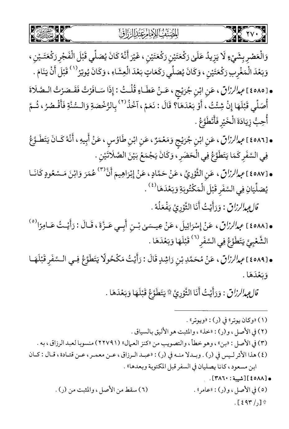 • [٤٥٨٧] عبد الرزاق، عَنِ الثَّوْريِّ، عَنْ حَمَّادٍ، عَنْ إِبْرَاهِيمَ أَنَّ (¬٣) عُمَرَ وَابْنَ مَسْعُودٍ كَانَا يُصَلِّيَانِ فِي السَّفَرِ قَبْلَ الْمَكْتُوبَةِ وَبَعْدَهَا (¬٤).