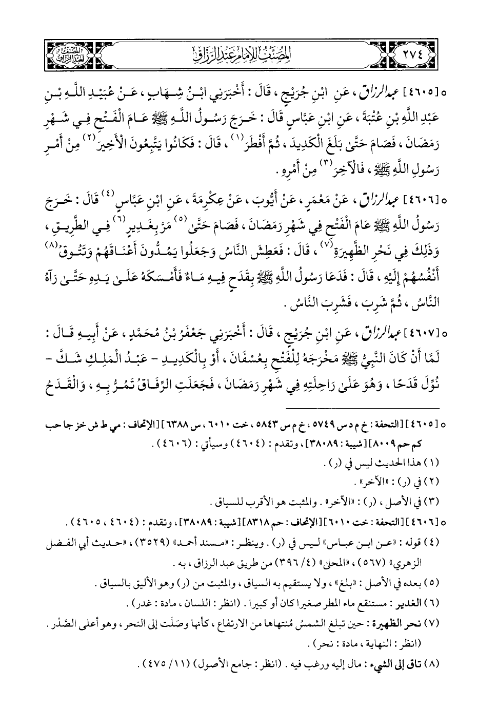 ° [٤٦٠٥] عبد الرزاق، عَنِ ابْنِ جُرَيْجٍ، قَالَ: أَخْبَرَنِي ابْنُ شِهَابٍ، عَنْ عُبَيْدِ اللَّهِ بْنِ عَبْدِ اللَّهِ بْنِ عُتْبَةَ، عَنِ ابْنِ عَبَّاسٍ قَالَ: خَرَجَ رَسُولُ اللَّهِ - صلى الله عليه وسلم - عامَ الْفَتْحِ فِي شَهْرِ رَمَضَانَ، فَصَامَ حَتَّى بَلَغَ الْكَدِيدَ، ثُمَّ أَفْطَرَ (¬١)، قَالَ: فَكَانُوا يَتَّبِعُونَ الْأَخِيرَ (¬٢) مِنْ أَمْرِ رَسُولِ اللَّهِ - صلى الله عليه وسلم -، فَالْآخِرَ (¬٣) مِنْ أَمْرِهِ.