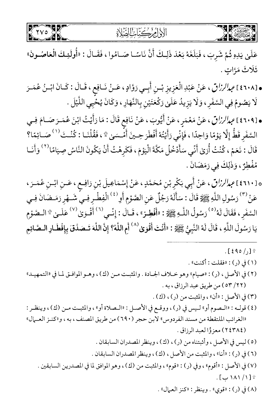 ° [٤٦١٠] عبد الرزاق، عَنْ أَبِي بَكْرِ بْنِ مُحَمَّدٍ، عَنْ إِسْمَاعِيلَ بْنِ رَافِعٍ، عَنِ ابْنِ عُمَرَ، عَنْ (¬٣) رَسُولِ اللهِ - صلى الله عليه وسلم - قَالَ: سَأَلَهُ رَجُلٌ عَنِ الصوْمِ أَوِ (¬٤) الْفِطْرِ فِي شَهْرِ رَمَضَانَ فِي السَّفَرِ، فَقَالَ لَهُ (¬٥) رَسُولُ اللَّهِ - صلى الله عليه وسلم -: "أَفْطِرْ"، قَالَ: إِنِّي (¬٦) أَقْوَى (¬٧) عَلَى * الصَّوْمِ يَا رَسُولَ اللهِ، قَالَ لَهُ النَّبِيُّ - صلى الله عليه وسلم -: "أَنْتَ أَقوَى (¬٨) أَمِ اللَّهُ؟ إِنَّ اللَّهَ تَصَدَّقَ بِإِفْطَارِ الصَّائِمِ