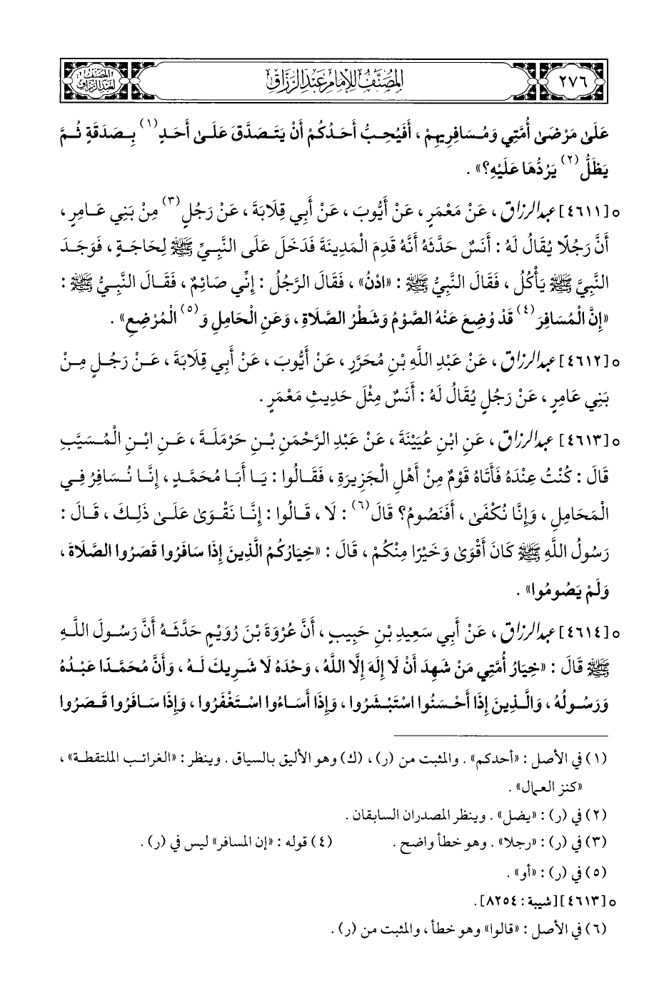 ° [٤٦١٤] عبد الرزاق، عَنْ أَبِي سَعِيدِ بْنِ حَبِيبٍ، أَنَّ عُرْوَةَ بْنَ رُوَيْمٍ حَدَّثَهُ أَنَّ رَسُولَ اللَّهِ - صلى الله عليه وسلم - قَالَ: "خِيَارُ أُمَّتِي مَنْ شَهِدَ أَنْ لَا إِلَهَ إِلَّا اللَّهُ، وَحْدَهُ لَا شَرِيكَ لَهُ، وَأَن مُحَمَّدًا عَبدُهُ وَرَسُولُهُ، وَالَّذِينَ إِذَا أَحْسَنُوا اسْتَبْشَرُوا، وإِذَا أَسَاءُوا اسْتَغْفَرُوا، وَإذَا سَافَرُوا قَصَرُوا