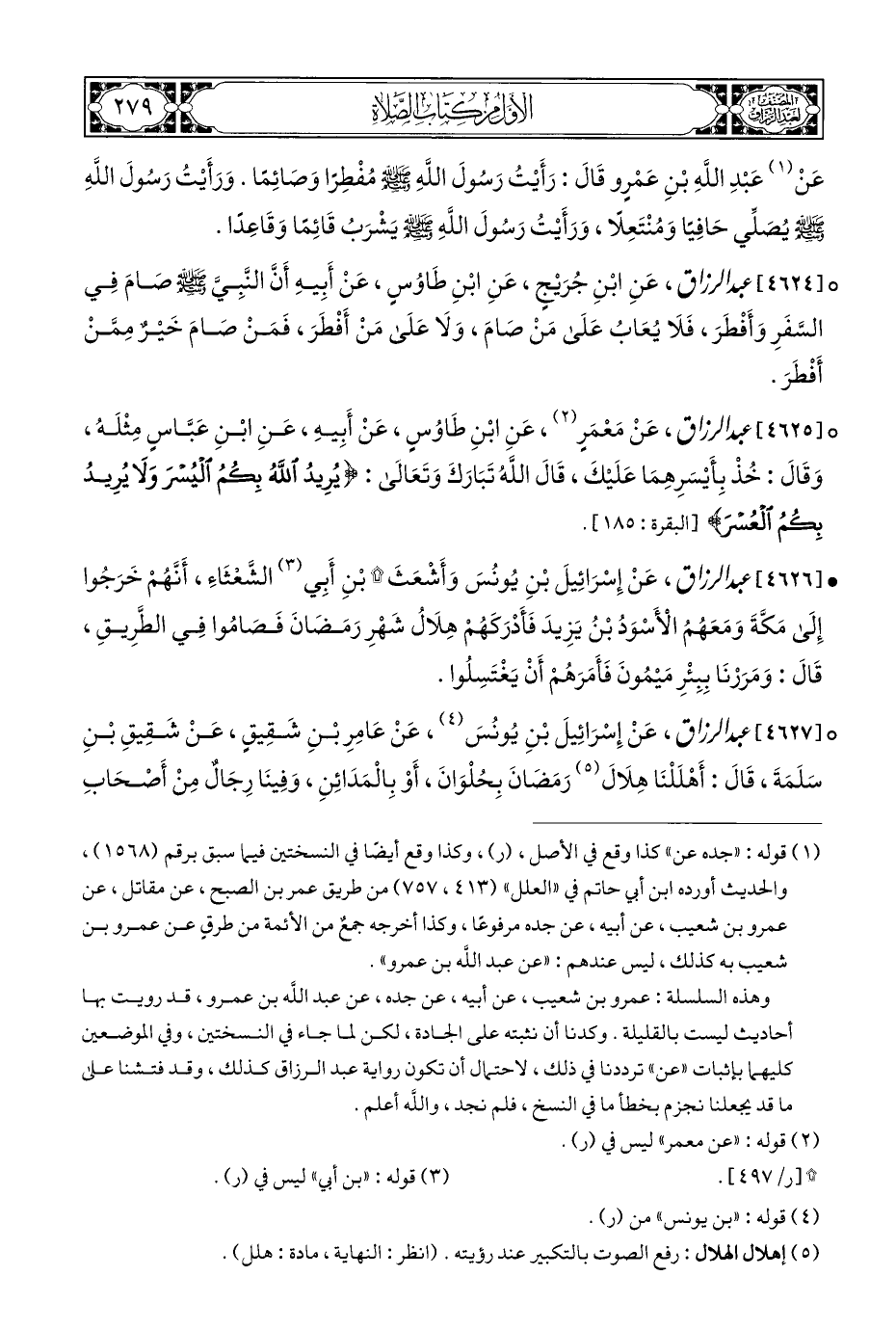 وهذه السلسلة: عمرو بن شعيب، عن أبيه، عن جده، عن عبد الله بن عمرو، قد رويت بها أحاديث ليست بالقليلة. وكدنا أن نثبته على الجادة، لكن لما جاء في النسختين، وفي الموضعين كليهما بإثبات "عن" ترددنا في ذلك، لاحتمال أن تكون رواية عبد الرزاق كذلك، وقد فتشنا على ما قد يجعلنا نجزم بخطأ ما في النسخ، فلم نجد، والله أعلم.