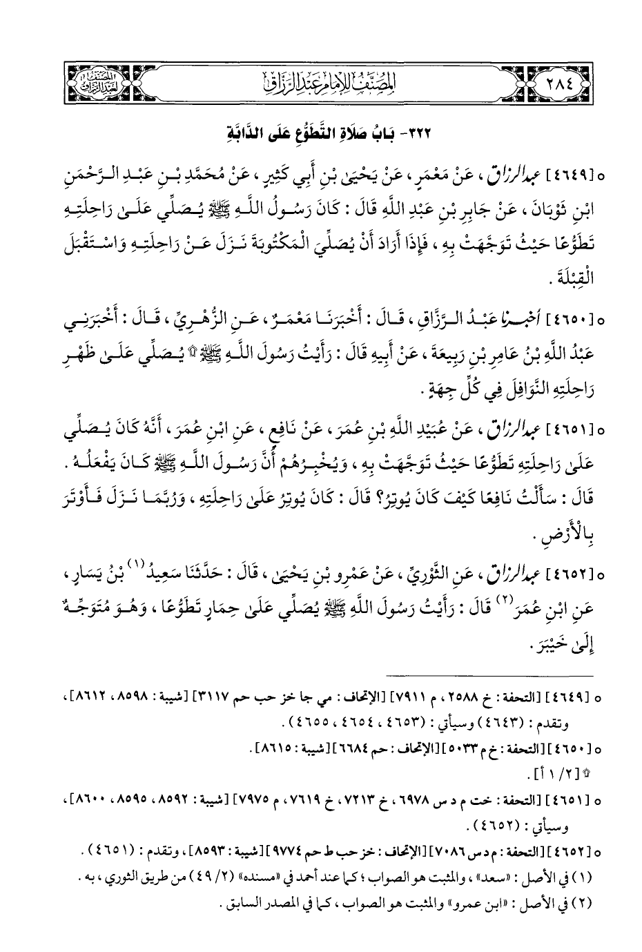 ° [٤٦٤٩] عبد الرزاق، عَنْ مَعْمَرٍ، عَنْ يَحْيَى بْنِ أَبِي كَثِيرٍ، عَنْ مُحَمَّدِ بْنِ عَبْدِ الرَّحْمَنِ بْنِ ثَوْبَانَ، عَنْ جَابِرِ بْنِ عَبْدِ اللَّهِ قَالَ: كَانَ رَسُولُ اللَّهِ - صلى الله عليه وسلم - يُصَلِّي عَلَى رَاحِلَتِهِ تَطَوُّعًا حَيْثُ تَوَجَّهَتْ بِهِ، فَإِذَا أَرَادَ أَنْ يُصَلِّيَ الْمَكْتُوبَةَ نَزَلَ عَنْ رَاحِلَتِهِ وَاسْتَقْبَلَ الْقِبْلَةَ.
