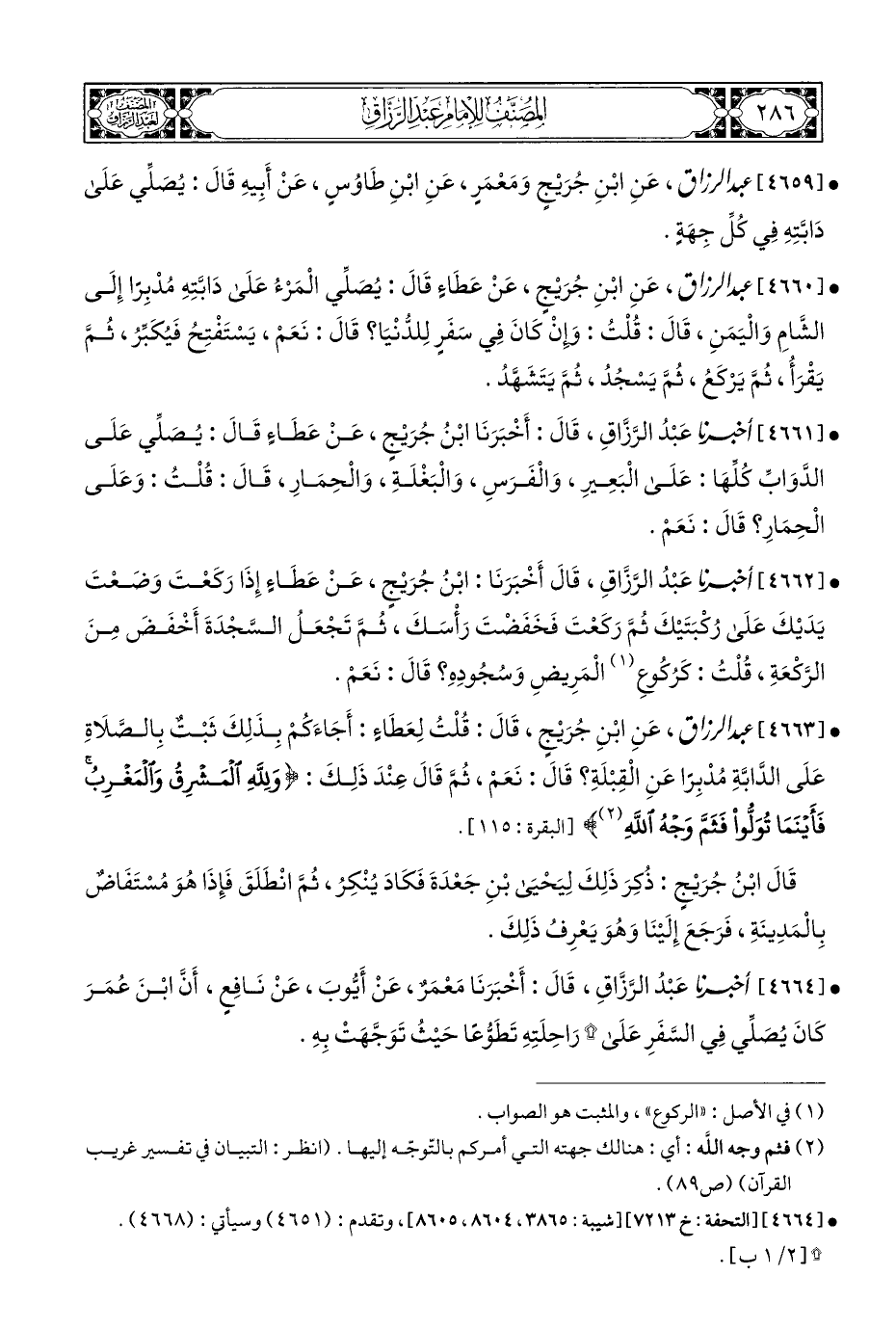 • [٤٦٦٣] عبد الرزاق، عَنِ ابْنِ جُرَيْجٍ، قَالَ: قُلْتُ لِعَطَاءَ: أَجَاءَكُمْ بِذَلِكَ ثَبْتٌ بِالصَّلَاةِ عَلَى الدَّابَّةِ مُدْبِرًا عَنِ الْقِبْلَةِ؟ قَالَ: نَعَمْ، ثُمَّ قَالَ عِنْدَ ذَلِكَ: {وَلِلَّهِ الْمَشْرِقُ وَالْمَغْرِبُ فَأَيْنَمَا تُوَلُّوا فَثَمَّ وَجْهُ اللَّهِ (¬٢)} [البقرة: ١١٥].