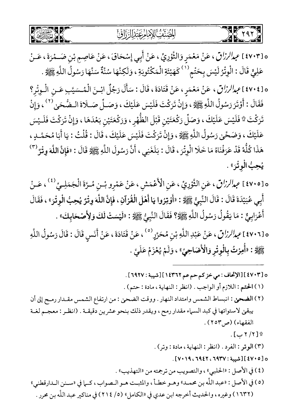 ° [٤٧٠٣] عبد الرزاق، عَنْ مَعْمَرٍ وَالثَّوْريِّ، عَنْ أَبِي إِسْحَاقَ، عَنْ عَاصمِ بْنِ ضمْرَةَ، عَنْ عَلِيٍّ قَالَ: الْوِتْرُ لَيْسَ بِحَتْمٍ (¬١) كَهَيْئَةِ الْمَكْتُوبَةِ، وَلكنَّهَا سُنَّةٌ سَنَّهَا رَسُولُ اللَّهِ - صلى الله عليه وسلم -.