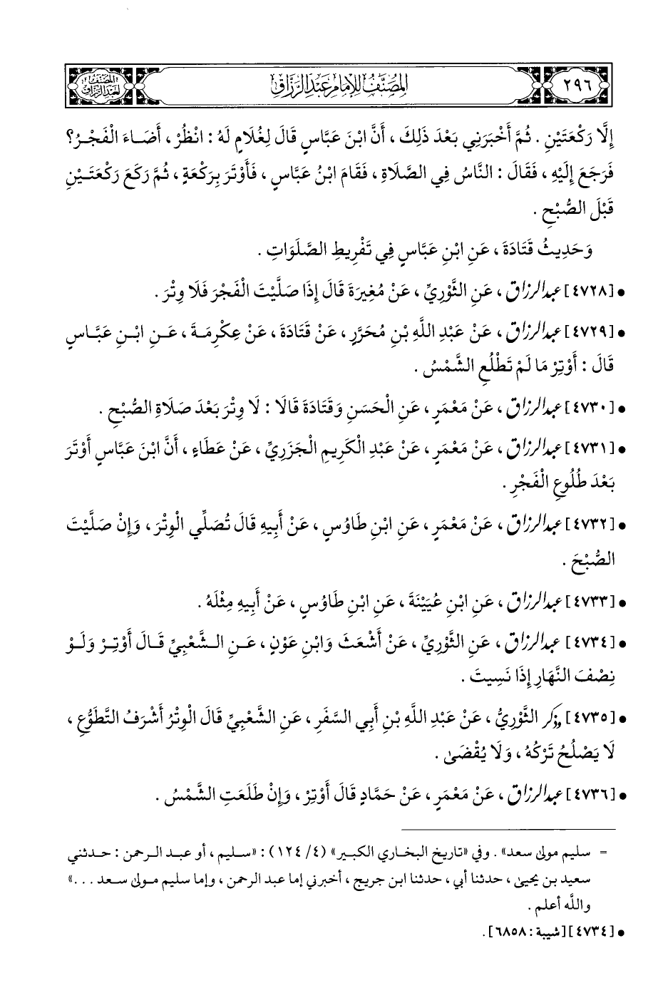 • [٤٧٢٨] عبد الرزاق، عَنِ الثَّوْريِّ، عَنْ مُغِيرَةَ قَالَ إِذَا صلَّيْتَ الْفَجْرَ فَلَا وِتْرَ.