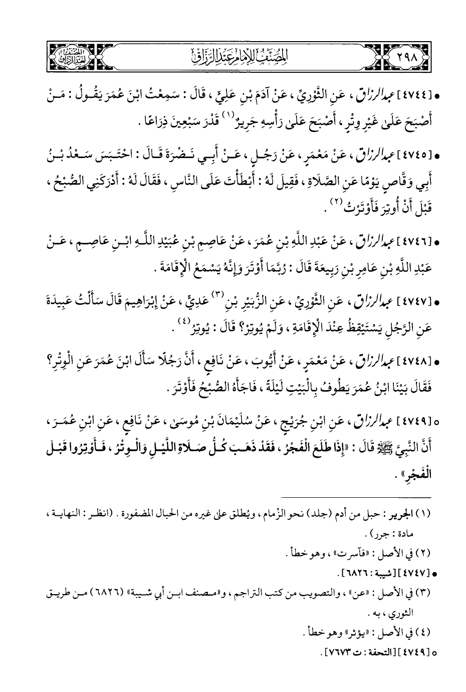 ° [٤٧٤٩] عبد الرزاق، عَنِ ابْنِ جُرَيْجٍ، عَنْ سُلَيْمَانَ بْنِ مُوسَى، عَنْ نَافِعٍ، عَنِ ابْنِ عُمَرَ، أَنَّ النَّبِيَّ - صلى الله عليه وسلم - قَالَ: "إِذَا طَلَعَ الْفَجْرُ، فَقَدْ ذَهَبَ كُلُّ صَلَاةِ اللَّيْلِ وَالْوِتْرُ، فَأَوْتِرُوا قَبْلَ الْفَجْرِ".
