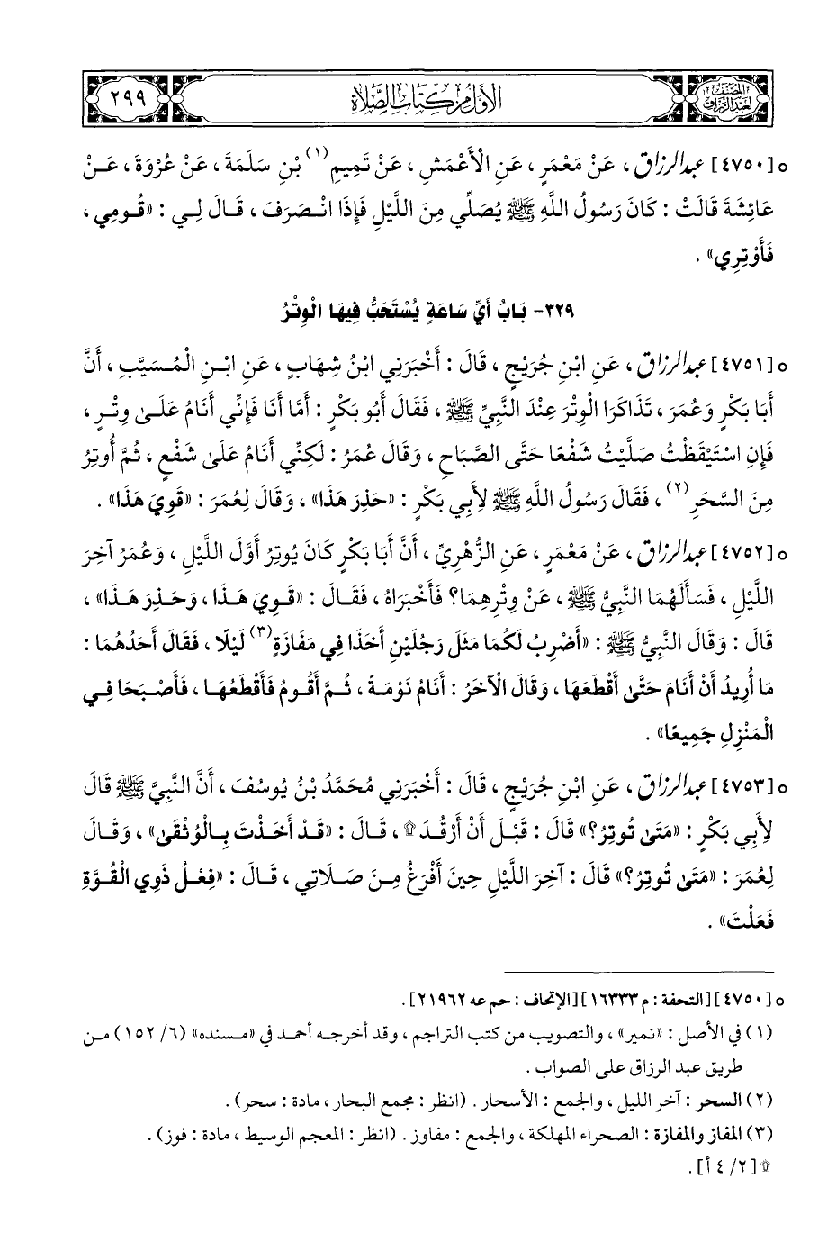 ° [٤٧٥٢] عبد الرزاق، عَنْ مَعْمَرٍ، عَنِ الزُّهْرِيِّ، أَنَّ أَبَا بَكْرٍ كَانَ يُوتِرُ أَوَّلَ اللَّيْلِ، وَعُمَرُ آخِرَ اللَّيْلِ، فَسَأَلَهُمَا النَّبِيُّ - صلى الله عليه وسلم -، عَنْ وِتْرِهِمَا؟ فَأَخْبَرَاهُ، فَقَالَ: "قَوِيَ هَذَا، وَحَذِرَ هَذَا"، قَالَ: وَقَالَ النَّبِيُّ - صلى الله عليه وسلم -: "أَضْرِبُ لَكُمَا مَثَلَ رَجُلَيْنِ أَخَذَا فِي مَفَازَةٍ (¬٣) لَيْلًا، فَقَالَ أَحَدُهُمَا: مَا أُرِيدُ أَنْ أَنَامَ حَتَّى أَقْطَعَهَا، وَقَالَ الْآخَرُ: أَنَامُ نَوْمَةً، ثُمَّ أَقُومُ فَأَقْطَعُهَا، فَأَصْبَحَا فِي الْمَنْزِلِ جَمِيعًا".