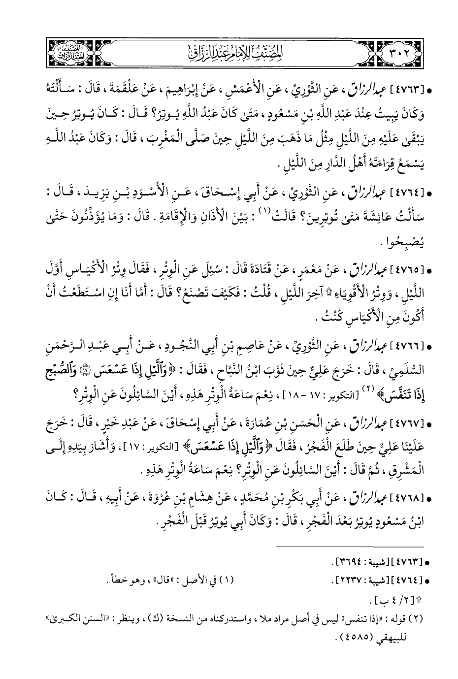 • [٤٧٦٤] عبد الرزاق، عَنِ الثَّوْريِّ، عَنْ أَبِي إِسْحَاقَ، عَنِ الْأَسْور بْنِ يَزِيدَ، قَالَ: سَأَلْتُ عَائِشَةَ مَتَى تُوتِرِينَ؟ قَالَتْ (¬١): بَيْنَ الْأَذَانِ وَالْإِقَامَةِ. قَالَ: وَمَا يُؤَذِّنُونَ حَتَّى يُصْبِحُوا.
