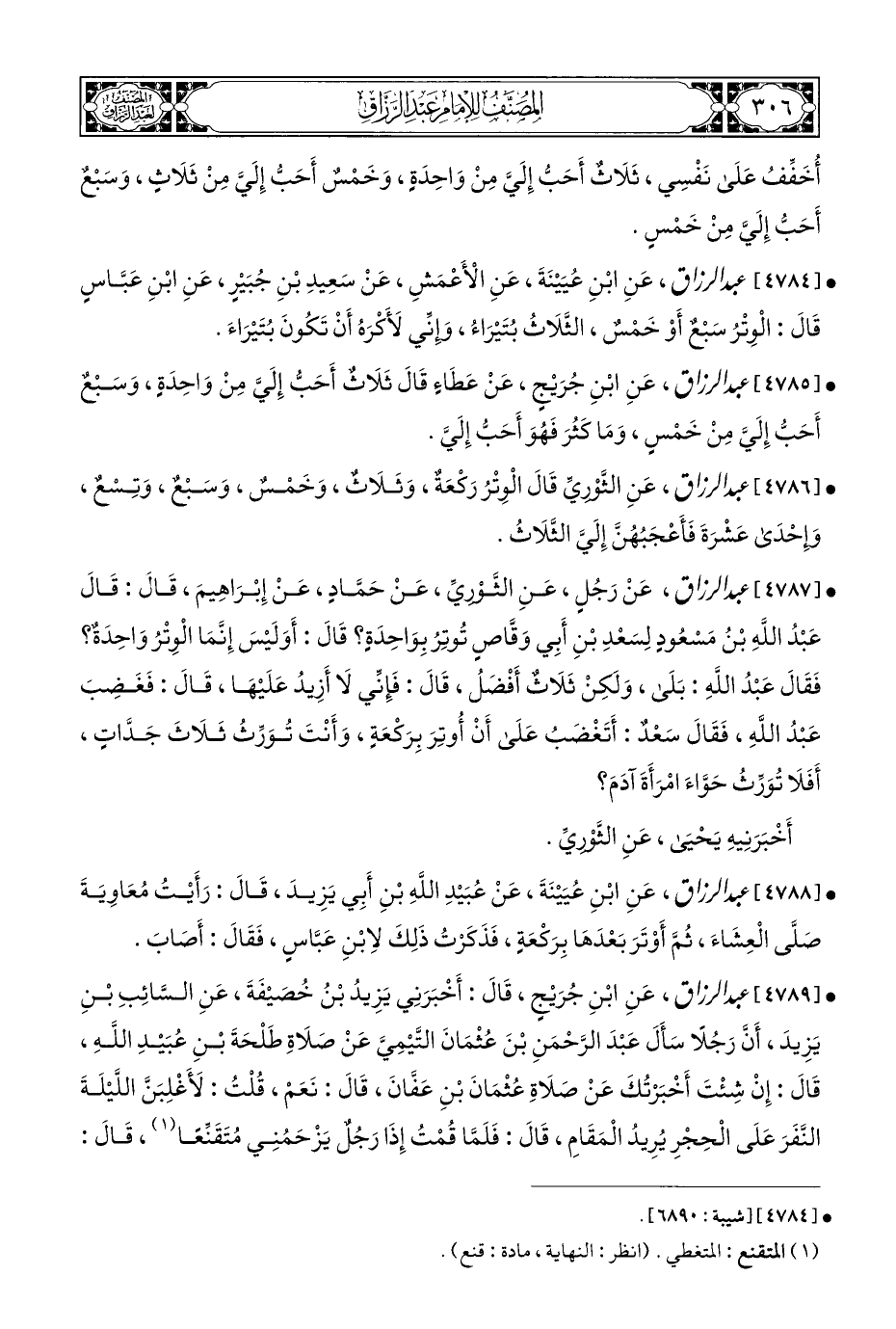 • [٤٧٨٦] عبد الرزاق، عَنِ الثَّوْريِّ قَالَ الْوِتْرُ رَكْعَةٌ، وَثَلَاثٌ، وَخَمْسٌ، وَسَبْعٌ، وَتِسْعٌ، وإحْدَى عَشْرَةَ فَأَعْجَبُهُنَّ إِلَيَّ الثَّلَاثُ.