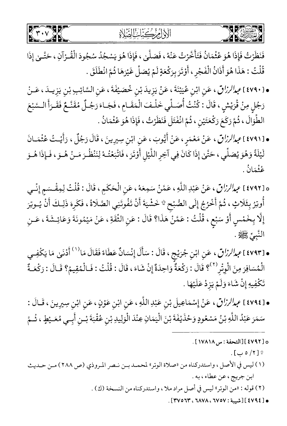 • [٤٧٩١] عبد الرزاق، عَنْ مَعْمَرٍ، عَنْ أَيُّوبَ، عَنِ ابْنِ سِيرِينَ، قَالَ رَجُلٌ، رَأَيْتُ عُثْمَانَ لَيْلَةً وَهُوَ يُصَلِّي، حَتَّى إِذَا كَانَ فِي آخِرِ اللَّيْلِ أَوْتَرَ، فَاتَّبَعْتُهُ لِنَنْظُرَ مَنْ هُوَ، فَإِذَا هُوَ عُثْمَانُ.