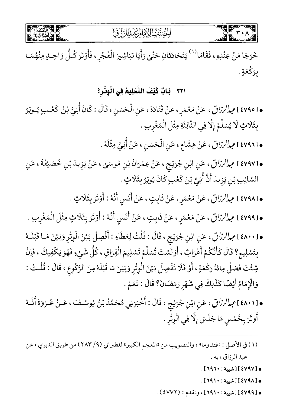 • [٤٨٠٠] عبد الرزاق، عَنِ ابْنِ جُرَيْجٍ، قَالَ: قُلْتُ لِعَطَاءٍ: أَفْصِلُ بَيْنَ الْوِتْرِ وَبَيْنَ مَا قَبْلَهُ بِتَسْلِيمٍ؟ قَالَ كَأَنَّكُمْ أَعْرَابٌ، أَوَلَسْتَ تُسَلِّمُ تَسْلِيمَ الْفِرَاقِ، كُلُّ شَيْءٍ فَهُوَ يَكْفِيكَ، فَإِنْ شِئْتَ فَصَلِّ مِائَةَ رَكْعَةٍ، أَوْ فَلَا تَفْصِلْ بَيْنَ الْوِتْرِ وَبَيْنَ مَا قَبْلَهُ مِنَ الرُّكُوعِ، قَالَ: قُلْتُ: وَالْإِمَامُ أَيْضًا كَذَلِكَ فِي شَهْرِ رَمَضَانَ؟ قَالَ: نَعَمْ.