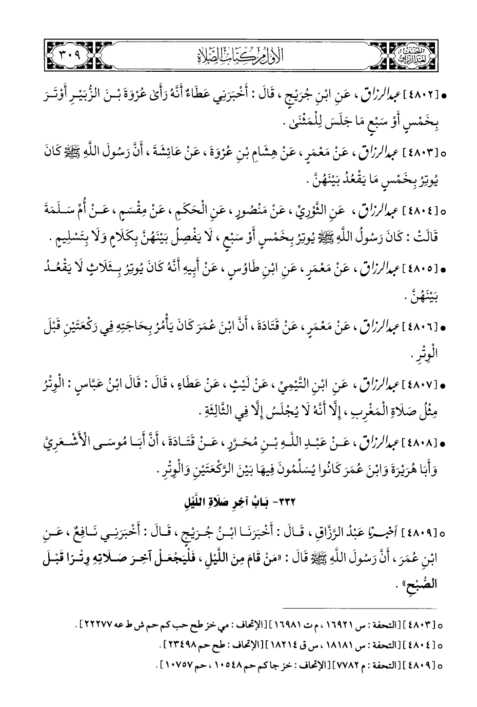 ° [٤٨٠٩] أخبرنا عَبْدُ الرَّزَّاقِ، قَالَ: أَخْبَرَنَا ابْنُ جُرَيْجٍ، قَالَ: أَخْبَرَنِي نَافِعٌ، عَنِ ابْنِ عُمَرَ، أَنَّ رَسُولَ اللهِ - صلى الله عليه وسلم - قَالَ: "مَنْ قَامَ مِنَ اللَّيْلِ، فَلْيَجْعَلْ آخِرَ صَلَاتِهِ وِتْرًا قَبْلَ الصُّبْحِ".