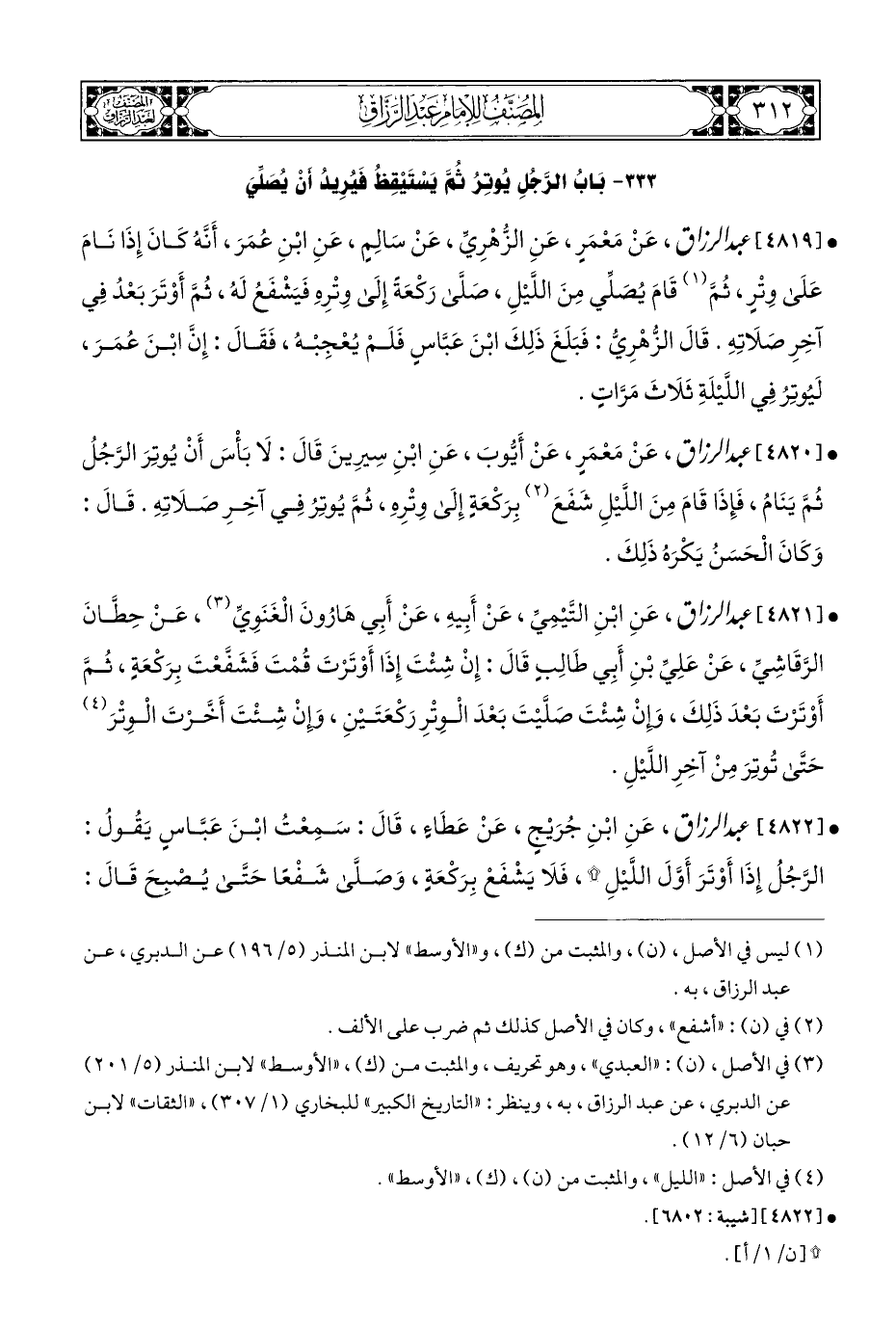 • [٤٨٢٠] عبد الرزاق، عَنْ مَعْمَرٍ، عَنْ أَيُّوبَ، عَنِ ابْنِ سِيرِينَ قَالَ: لَا بَأْسَ أَنْ يُوتِرَ الرَّجُلُ ثُمَّ يَنَامُ، فَإِذَا قَامَ مِنَ اللَّيْلِ شَفَعَ (¬٢) بِرَكْعَةٍ إِلَى وِتْرِهِ، ثُمَّ يُوتِرُ فِي آخِرِ صلَاتِهِ. قَالَ: وَكَانَ الْحَسَنُ يَكْرَهُ ذَلِكَ.