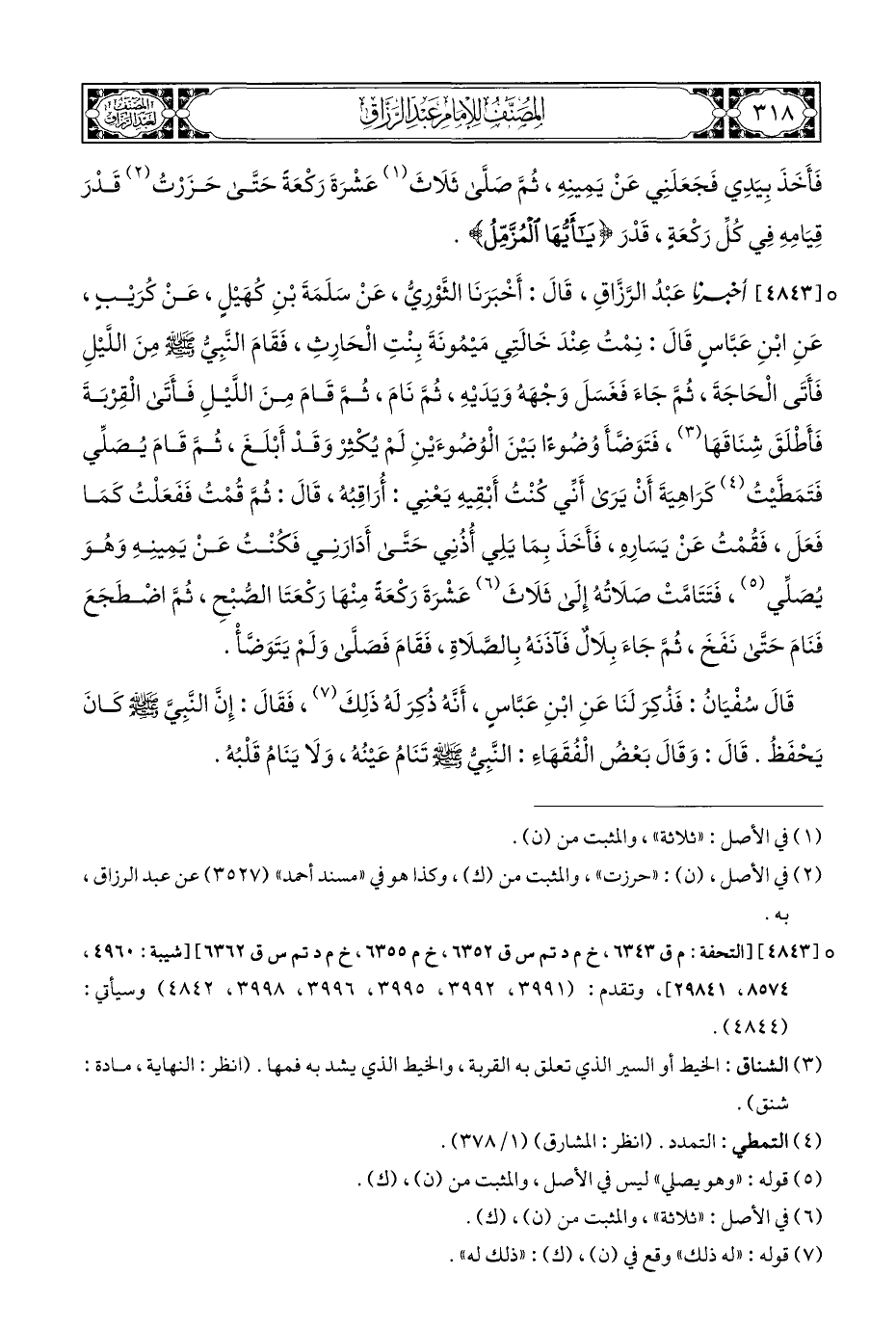 ° [٤٨٤٣] أخبرنا عَبْدُ الرَّزَّاقِ، قَالَ: أَخْبَرَنَا الثَّوْرِيُّ، عَنْ سَلَمَةَ بْنِ كُهَيْلٍ، عَنْ كُرَيْبٍ، عَنِ ابْنِ عَبَّاسٍ قَالَ: نِمْتُ عَنْدَ خَالَتِي مَيْمُونَةَ بِنْتِ الْحَارِثِ، فَقَامَ النَّبِيُّ - صلى الله عليه وسلم - منَ اللَّيْلِ فَأَتَى الْحَاجَةَ، ثُمَّ جاءَ فَغَسَلَ وَجْهَهُ وَيَدَيْهِ، ثُمَّ نَامَ، ثُمَّ قَامَ مِنَ اللَّيْلِ فَأَتَى الْقِرْبَةَ فَأَطْلَقَ شِنَاقَهَا (¬٣)، فَتَوَضَّأَ وُضُوءًا بَيْنَ الْوُضُوءَيْنِ لَمْ يُكْثِرْ وَقَدْ أَبْلَغَ، ثُمَّ قَامَ يُصَلِّي فَتَمَطَّيْتُ (¬٤) كَرَاهِيَةَ أَنْ يَرَى أَنِّي كُنْتُ أَبْقِيهِ يَعْنِي: أُرَاقِبُهُ، قَالَ: ثُمَّ قُمْتُ فَفَعَلْتُ كَمَا فَعَلَ، فَقُمْتُ عَنْ يَسَارِهِ، فَأَخَذَ بِمَا يَلِي أُذُنِي حَتَّى أَدَارَنِي فَكُنْتُ عَنْ يَمِينِهِ وَهُوَ يُصَلِّي (¬٥)، فَتَتَامَّتْ صَلَاتُهُ إِلَى ثَلَاثَ (¬٦) عَشْرَةَ رَكْعَةً مِنْهَا رَكْعَتَا الصُّبْحِ، ثُمَّ اضْطَجَعَ فَنَامَ حَتَّى نَفَخَ، ثُمَّ جَاءَ بِلَالٌ فَآذَنَهُ بِالصَّلَاةِ، فَقَامَ فَصَلَّى وَلَمْ يَتَوَضَّأْ.