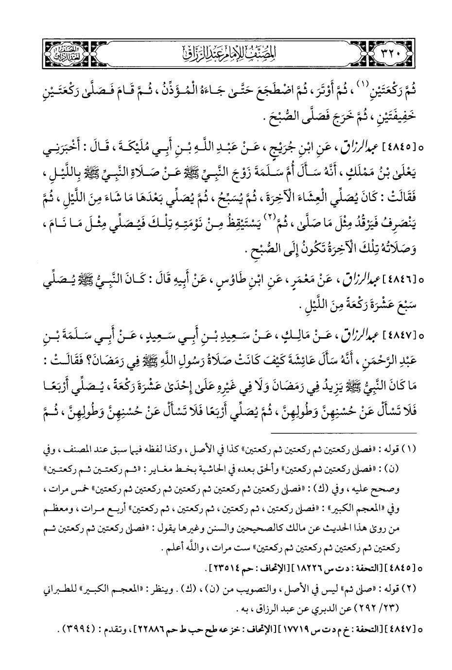 ° [٤٨٤٦] عبد الرزاق، عَنْ مَعْمَرٍ، عَنِ ابْنِ طَاوُسٍ، عَنْ أَبِيهِ قَالَ: كَانَ النَّبِيُّ - صلى الله عليه وسلم - يُصَلِّي سَبْعَ عَشْرَةَ رَكْعَةً مِنَ اللَّيْلِ.