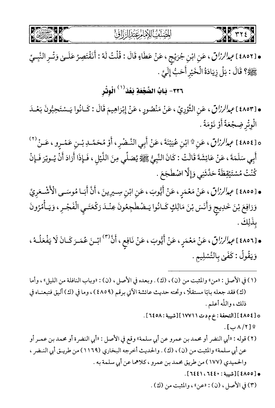 ° [٤٨٥٤] عبد الرزاق، عَنِ (*) ابْنِ عُيَيْنَةَ، عَنْ أَبِي النَّضْرِ، أَوْ مُحَمَّدِ بْنِ عَمْرٍو، عَنْ (¬٢) أَبِي سَلَمَةَ، عَنْ عَائِشَةَ قَالَتْ: كَانَ النَّبِيُّ - صلى الله عليه وسلم - يُصَلِّي مِنَ اللَّيْلِ، فَإِذَا أَرَادَ أَنْ يُوتِرَ فَإِنْ كُنْتُ مُسْتَيْقِظَةً حَدَّثَنِي وإِلَّا اضْطَجَعَ.