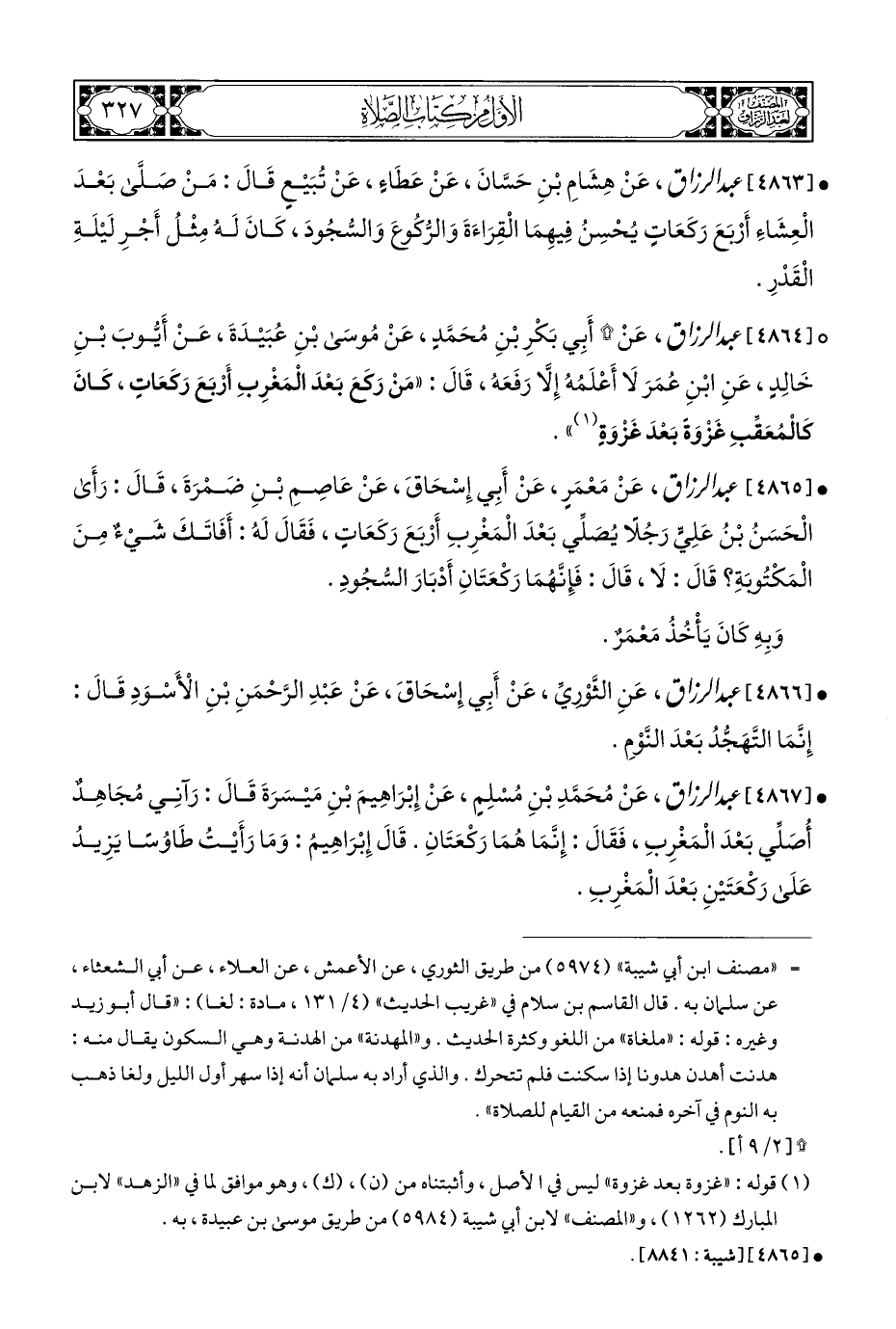 ° [٤٨٦٤] عبد الرزاق، عَنْ (*) أَبِي بَكْرِ بْنِ مُحَمَّدٍ، عَنْ مُوسَى بْنِ عُبَيْدَةَ، عَنْ أَيُّوبَ بْنِ خَالِدِ، عَنِ ابْنِ عُمَرَ لَا أَعْلَمُهُ إِلَّا رَفَعَهُ، قَالَ: "مَنْ رَكَعَ بَعْدَ الْمَغْرِبِ أَرْبَعَ رَكَعَاتٍ، كَانَ كَالْمُعَقِّبِ غَزْوَةً بَعْدَ غَزْوَةٍ (¬١) ".