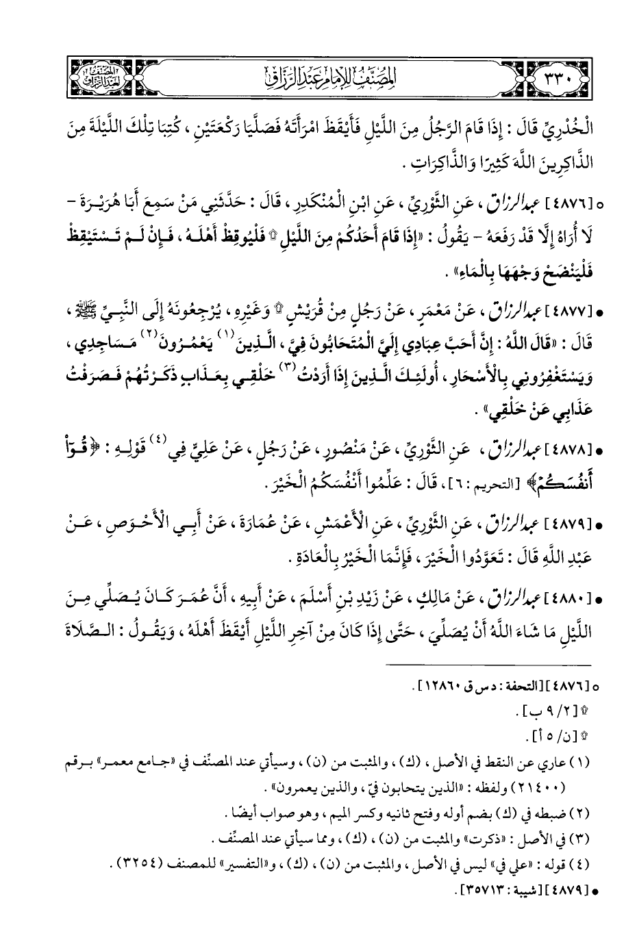 • [٤٨٧٨] عبد الرزاق، عَنِ الثَّوْريِّ، عَنْ مَنْصُورٍ، عَنْ رَجُلٍ، عَنْ عَلِيٍّ فِي (¬٤) قَوْلِهِ: {قُوا أَنْفُسَكُمْ} [التحريم: ٦]، قَالَ: عَلِّمُوا أَنْفُسَكُمُ الْخَيْرَ.