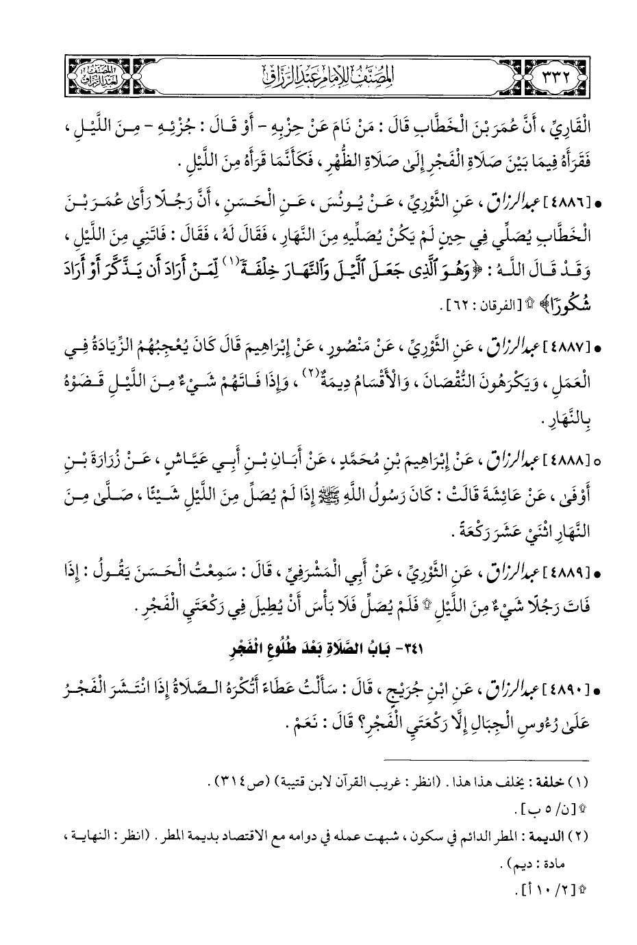 • [٤٨٨٦] عبد الرزاق، عَنِ الثَّوْريِّ، عَنْ يُونُسَ، عَنِ الْحَسَنِ، أَنَّ رَجُلًا رَأَى عُمَرَ بْنَ الْخَطَّابِ يُصَلِّي فِي حِين لَمْ يَكُنْ يُصَلِّيهِ مِنَ النَّهَارِ، فَقَالَ لَهُ، فَقَالَ: فَاتَنِي مِنَ اللَّيْلِ، وَقَدْ قَالَ اللهُ: {وَهُوَ الَّذِي جَعَلَ اللَّيْلَ وَالنَّهَارَ خِلْفَةً (¬١) لِمَنْ أَرَادَ أَنْ يَذَّكَّرَ أَوْ أَرَادَ شُكُورًا} (*) [الفرقان: ٦٢].