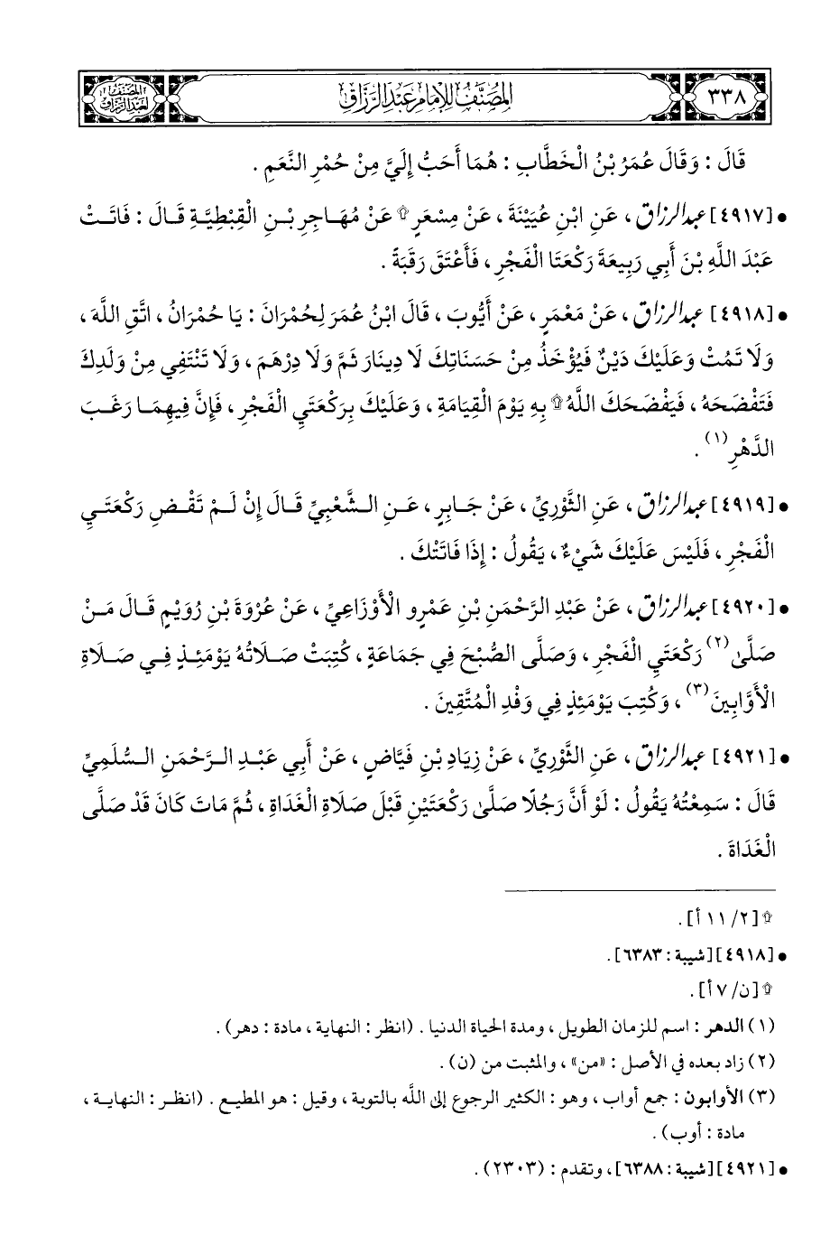 • [٤٩٢٠] عبد الرزاق، عَنْ عَبْدِ الرَّحْمَنِ بْنِ عَمْرٍو الْأَوْزَاعِيِّ، عَنْ عُروَةَ بْنِ رُوَيْمٍ قَالَ مَنْ صلَّى (¬٢) رَكْعَتَيِ الْفَجْرِ، وَصلَّى الصُّبْحَ فِي جَمَاعَةٍ، كُتِبَتْ صَلَاتُهُ يَوْمَئِذٍ فِي صَلَاةِ الْأَوَّابِينَ (¬٣)، وَكُتِبَ يَوْمَئِذٍ فِي وَفْدِ الْمُتَّقِينَ.