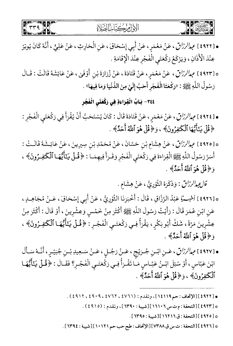 ° [٤٩٢٣] عبد الرزاق، عَنْ مَعْمَرٍ، عَنْ قَتَادَةَ، عَنْ زُرَارَةَ بْنِ أَوْفَى، عَنْ عَائِشَةَ قَالَتْ: قَالَ رَسُولُ اللهِ - صلى الله عليه وسلم -: "رَكْعَتَا الْفَجْرِ أَحَبُّ إِلَيَّ مِنَ الدُّنْيَا وَمَا فِيهَا".