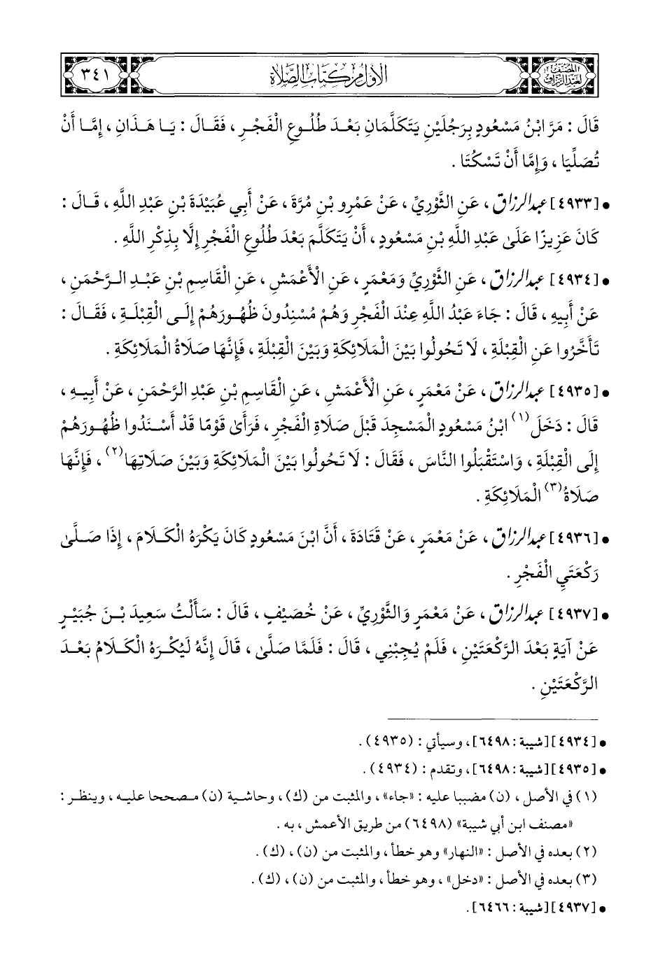 • [٤٩٣٥] عبد الرزاق، عَنْ مَعْمَرٍ، عَنِ الْأَعْمَشِ، عَنِ الْقَاسِمِ بْنِ عَبْدِ الرَّحْمَنِ، عَنْ أَبِيهِ، قَالَ: دَخَلَ (¬١) ابْنُ مَسْعُودٍ الْمَسْجِدَ قَبْلَ صَلَاةِ الْفَجْرِ، فَرَأَى قَوْمًا قَدْ أَسْنَدُوا ظُهُورَهُمْ إِلَى الْقِبْلَةِ، وَاسْتَقْبَلُوا النَّاسَ، فَقَالَ: لَا تَحُولُوا بَيْنَ الْمَلَائِكَةِ وَبَيْنَ صَلَاتِهَا (¬٢)، فَإِنَّهَا صَلَاةُ (¬٣) الْمَلَائِكَةِ.