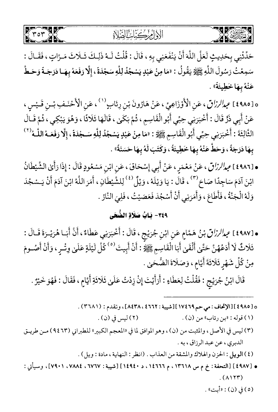 ° [٤٩٨٥] عبد الرزاق، عَنِ الْأَوْزَاعِيِّ، عَنْ هَارُونَ بْنِ رِئَابٍ (¬١)، عَنِ الْأَحْنَفِ بْنِ قَيْسٍ، عَنْ أَبِي ذَرٍّ قَالَ: أَخْبَرَنِي حِبِّي أَبُو الْقَاسِمِ، ثُمَّ بَكَى، قَالَهَا ثَلَاثًا، وَهُوَ يَبْكِي، ثُمَّ قَالَ الثَّالِثَةَ: أَخْبَرَنِي حِبِّي أَبُو الْقَاسِمِ - صلى الله عليه وسلم -: "مَا مِنْ عَبْدٍ يَسْجُدُ لِلَّهِ سَجْدَةً، إِلّا رَفَعَهُ اللهُ (¬٢) بِهَا دَرَجَةً، وَحَطَّ عَنْهُ بِهَا خَطِيئَةً، وَكَتَبَ لَهُ بِهَا حَسَنَةً".
