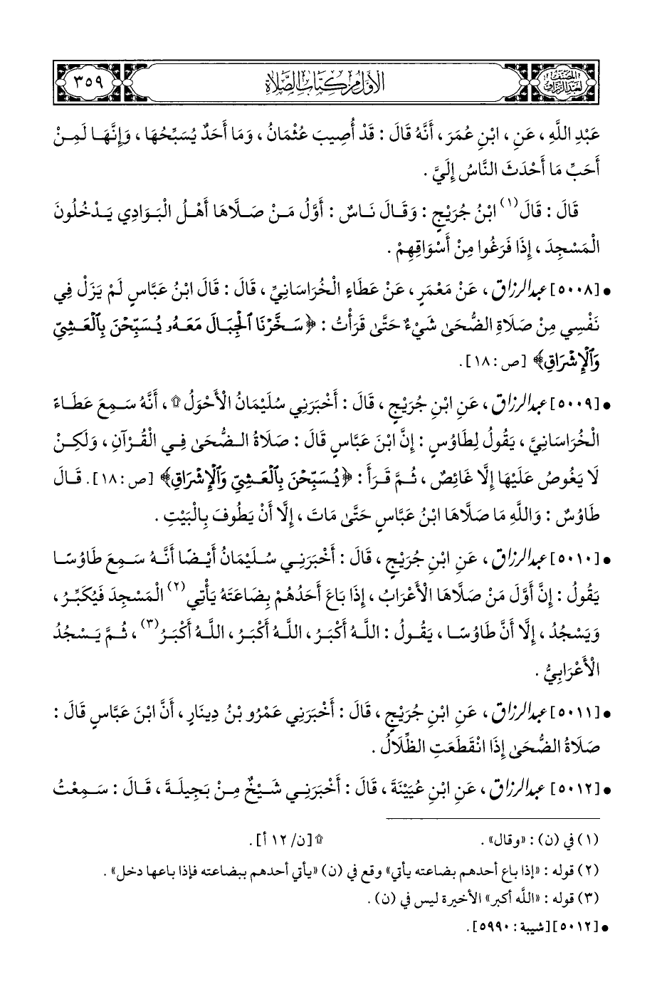 • [٥٠٠٩] عبد الرزاق، عَنِ ابْنِ جُرَيْجٍ، قَالَ: أَخْبَرَنِي سُلَيْمَانُ الأَحْوَلُ *، أَنَّهُ سَمِعَ عَطَاءً الْخُرَاسَانِيَّ، يَقُولُ لِطَاوُسٍ: إِنَّ ابْنَ عَبَّاسٍ قَالَ: صَلَاةُ الضُّحَى فِي الْقُرْآنِ، وَلكِنْ لَا يَغُوصُ عَلَيْهَا إِلَّا غَائِصٌ، ثُمَّ قَرَأَ: {يُسَبِّحْنَ بِالعَشِيِّ وَالإِشْرَاقِ} [ص: ١٨]. قَالَ طَاوُسٌ: وَاللَّهِ مَا صَلَّاهَا ابْنُ عَبَّاسٍ حَتَّى مَاتَ، إِلَّا أَنْ يَطُوفَ بِالْبَيْتِ.