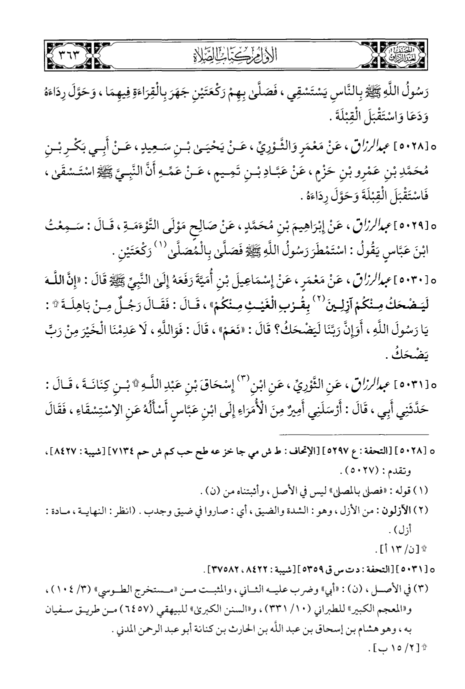 ° [٥٠٢٨] عبد الرزاق، عَنْ مَعْمَرٍ وَالثَّوْرِيِّ، عَنْ يَحْيَى بْنِ سَعِيدٍ، عَنْ أَبِي بَكْرِ بْنِ مُحَمَّدِ بْنِ عَمْرِو بْنِ حَزْمٍ، عَنْ عَبَّادِ بْنِ تَمِيمٍ، عَنْ عَمِّهِ أَنَّ النَّبِيَّ - صلى الله عليه وسلم - اسْتَسْقَى، فَاسْتَقْبَلَ الْقِبْلَةَ وَحَوَّلَ رِدَاءَهُ.