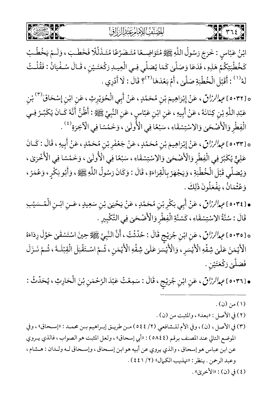 ° [٥٠٣٢] عبد الرزاق، عَنْ إِبْرَاهِيمَ بْنِ مُحَمَّدٍ، عَنْ أَبِي الْحُوَيْرِثِ، عَنِ ابْنِ إِسْحَاقَ (¬٣) بْنِ عَبْدِ اللَّهِ بْنِ كِنَانَةَ، عَنْ أَبِيهِ، عَنِ ابْنِ عَبَّاسٍ، عَنِ النَّبِيِّ - صلى الله عليه وسلم -: أَظُنُّ أَنَّهُ كَانَ يُكَبِّرُ فِي الْفِطْرِ وَالْأَضْحَى وَالاِسْتِسْقَاءِ، سَبْعًا فِي الْأُولَى، وَخَمْسًا فِي الْآخِرَةِ (¬٤).