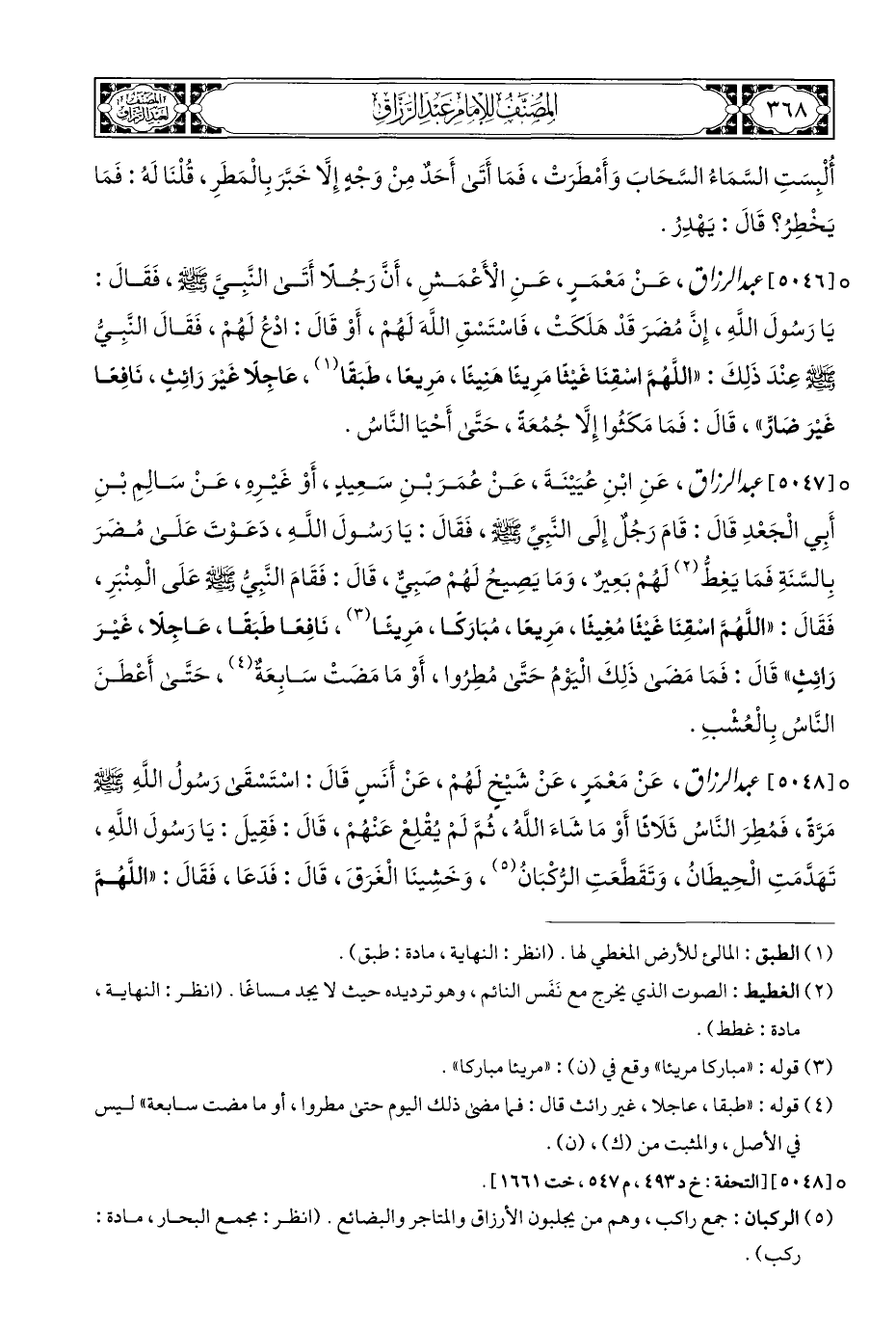 ° [٥٠٤٦] عبد الرزاق، عَنْ مَعْمَرٍ، عَنِ الْأَعْمَشِ، أَنَّ رَجُلًا أَتَى النَّبِيَّ - صلى الله عليه وسلم -، فَقَالَ: يَا رَسُولَ اللَّهِ، إِن مُضَرَ قَدْ هَلَكَتْ، فَاسْتَسْقِ اللَّهَ لَهُمْ، أَوْ قَالَ: ادْعُ لَهُمْ، فَقَالَ النَّبِيُّ - صلى الله عليه وسلم - عنْدَ ذَلِكَ: "اللَّهُمَّ اسْقِنَا غَيْثًا مَرِيئًا هَنِيئًا، مَرِيعًا، طَبَقًا (¬١)، عَاجِلًا غَيْرَ رَائِثٍ، نَافِعًا غَيْرَ ضَارٍّ"، قَالَ: فَمَا مَكَثُوا إِلَّا جُمُعَةً، حَتَّى أَحْيَا النَّاسُ.