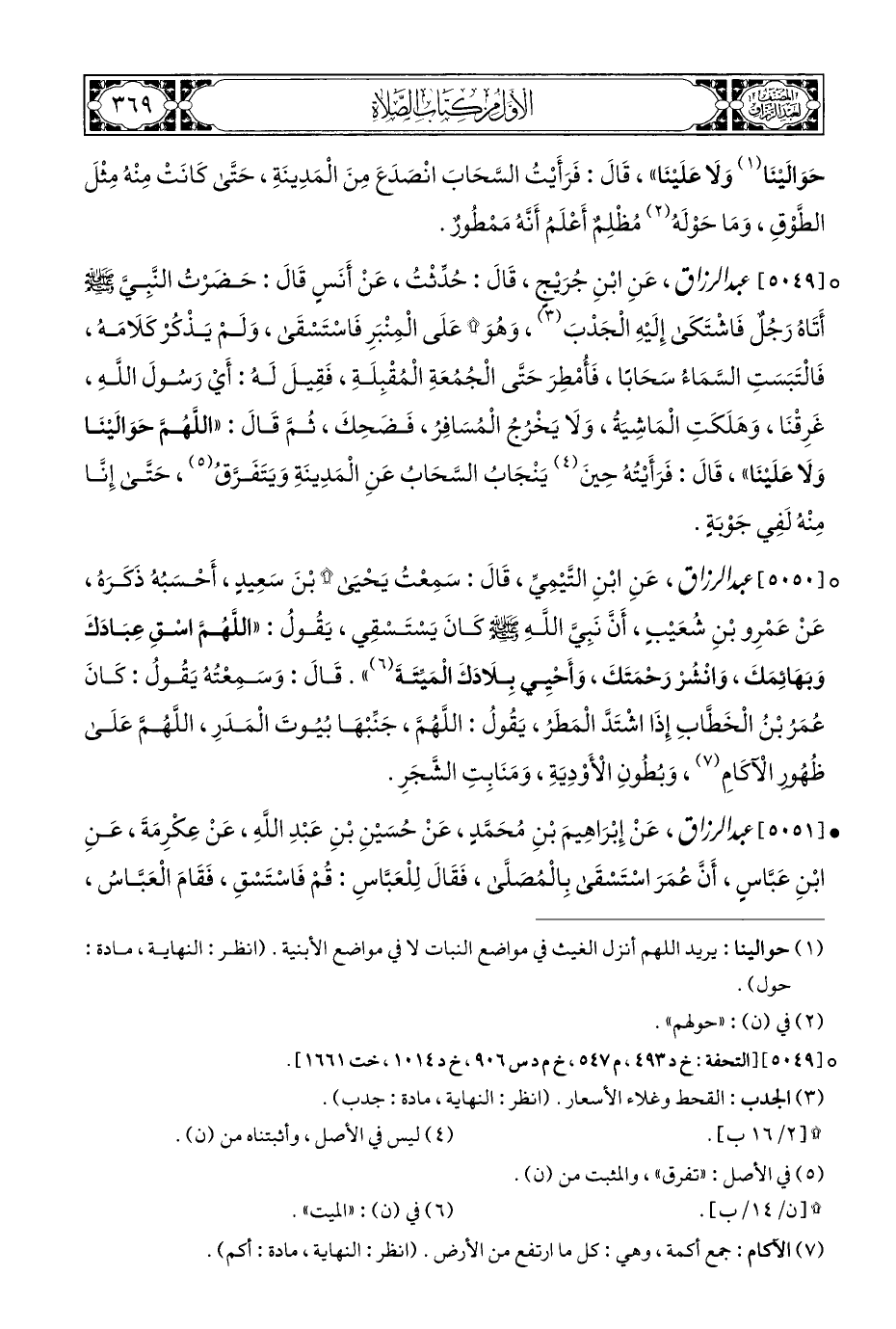 ° [٥٠٤٩] عبد الرزاق، عَنِ ابْنِ جُرَيْجٍ، قَالَ: حُدِّثْتُ، عَنْ أَنَسٍ قَالَ: حَضَرْتُ النَّبِيَّ - صلى الله عليه وسلم - أَتَاهُ رَجُلٌ فَاشْتَكَى إِلَيْهِ الْجَدْبَ (¬٣)، وَهُوَ * عَلَى الْمِنْبَرِ فَاسْتَسْقَى، وَلَمْ يَذْكُرْ كَلَامَهُ، فَالْتَبَسَتِ السَّمَاءُ سَحَابًا، فَأُمْطِرَ حَتَّى الْجُمُعَةِ الْمُقْبِلَةِ، فَقِيلَ لَهُ: أَيْ رَسُولَ اللَّهِ، غَرِقْنَا، وَهَلَكَتِ الْمَاشِيَةُ، وَلَا يَخْرُجُ الْمُسَافِرُ، فَضَحِكَ، ثُمَّ قَالَ: "اللَّهُمَّ حَوَالَيْنَا وَلَا عَلَيْنَا"، قَالَ: فَرَأَيْتُهُ حِينَ (¬٤) يَنْجَابُ السَّحَابُ عَنِ الْمَدِينَةِ وَيَتَفَرَّقُ (¬٥)، حَتَّى إِنَّا مِنْهُ لَفِي جَوْيَةٍ.