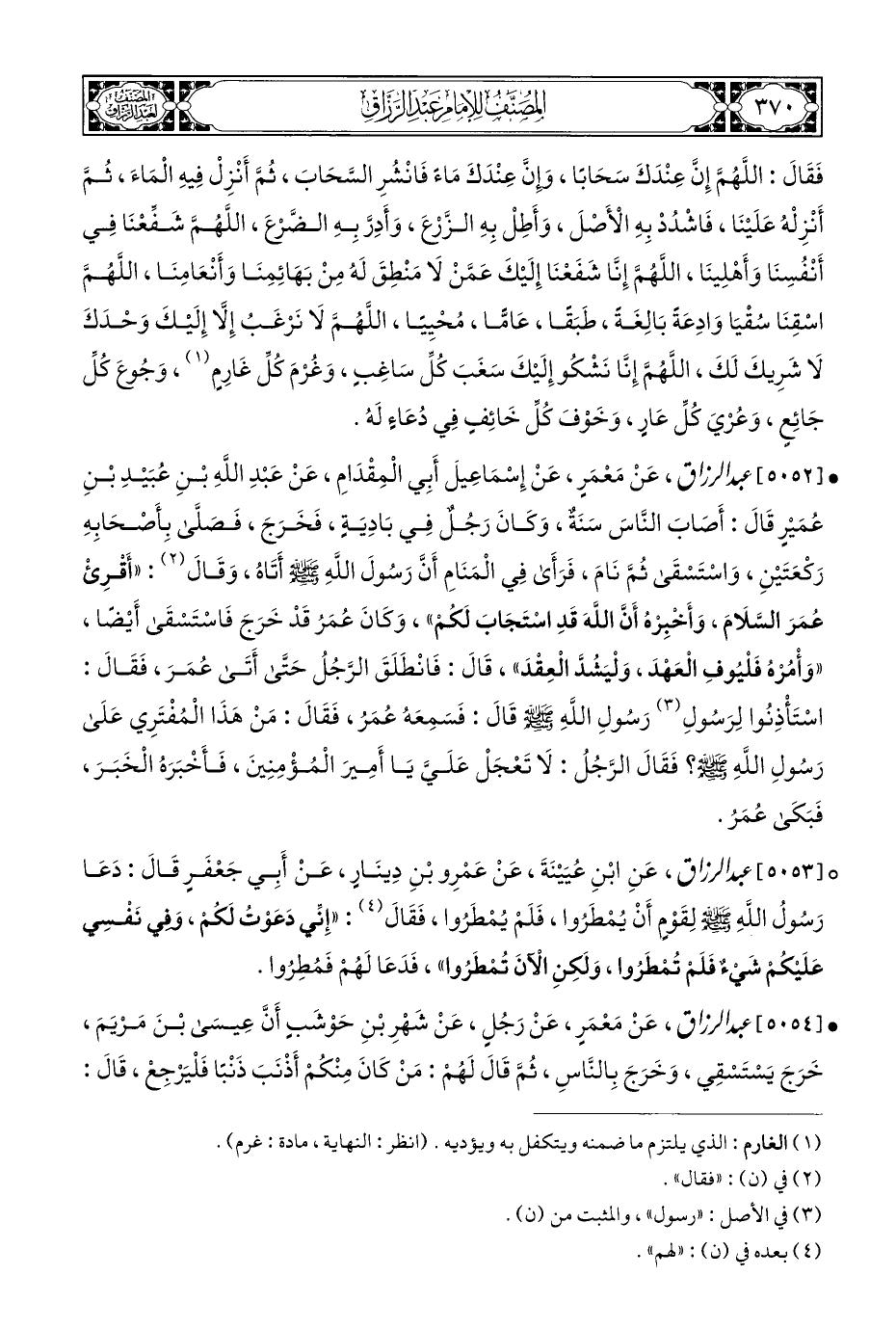 • [٥٠٥٢] عبد الرزاق، عَنْ مَعْمَر، عَنْ إِسْمَاعِيلَ أَبِي الْمِقْدَامِ، عَنْ عَبْدِ اللَّهِ بْنِ عُبَيْدِ بْنِ عُمَيْرٍ قَالَ: أَصابَ النَّاسَ سَنَةٌ، وَكَانَ رَجُلٌ فِي بَادِيَةٍ، فَخَرَجَ، فَصلَّى بِأَصْحَابِهِ رَكْعَتَيْنِ، وَاسْتَسْقَى ثُمَّ نَامَ، فَرَأَى فِي الْمَنَامِ أَنَّ رَسُولَ اللَّهِ - صلى الله عليه وسلم - أَتَاهُ، وَقَالَ (¬٢): "أَقْرِئْ عُمَرَ السَّلَامَ، وَأَخْبِرْهُ أَنَّ اللَّهَ قَدِ اسْتَجَابَ لَكُمْ"، وَكَانَ عُمَرُ قَدْ خَرَجَ فَاسْتَسْقَى أَيْضا، "وَأْمُرْهُ فَلْيُوفِ الْعَهْدَ، وَلْيَشُدَّ الْعِقْدَ"، قَالَ: فَانْطَلَقَ الرَّجُلُ حَتَّى أَتَى عُمَرَ، فَقَالَ: اسْتَأْذِنُوا لِرَسُولِ (¬٣) رَسُولِ اللهِ - صلى الله عليه وسلم - قَالَ: فَسَمِعَهُ عُمَرُ، فَقَالَ: مَنْ هَذَا الْمُفْتَرِي عَلَى رَسُولِ الله - صلى الله عليه وسلم -؟ فَقَالَ الرَّجُلُ: لَا تَعْجَلْ عَلَي يَا أَمِيرَ الْمُؤْمِنِينَ، فَأَخْبَرَهُ الْخَبَرَ، فَبَكَى عُمَرُ.