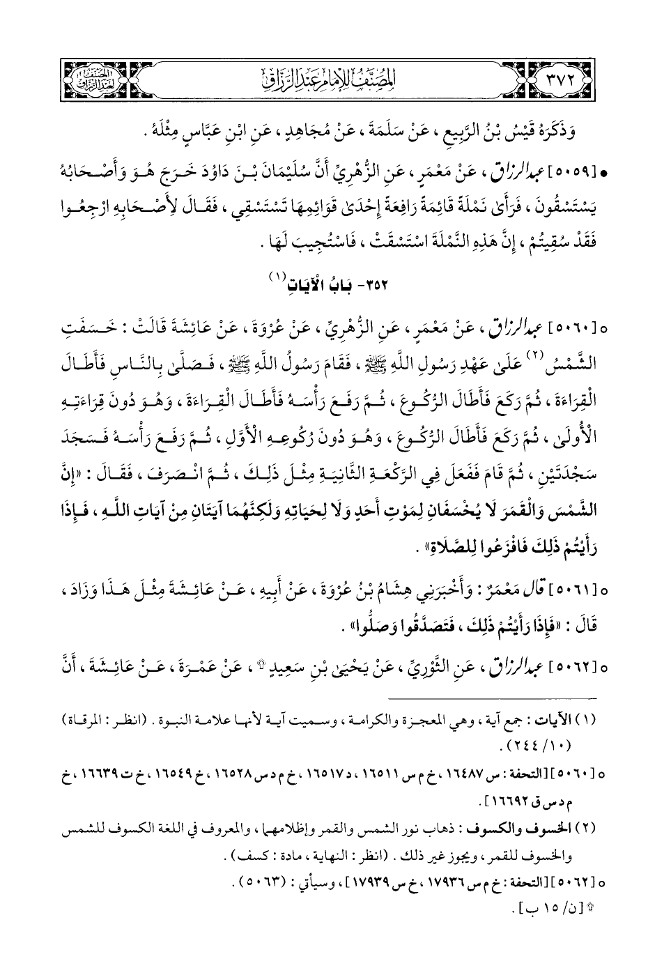 ° [٥٠٦٠] عبد الرزاق، عَنْ مَعْمَرٍ، عَنِ الزُّهْرِيِّ، عَنْ عُرْوَةَ، عَنْ عَائِشَةَ قَالَتْ: خَسَفَتِ الشَّمْسُ (¬٢) عَلَى عَهْدِ رَسولِ اللَّهِ - صلى الله عليه وسلم -، فَقَامَ رَسُولُ اللَّهِ - صلى الله عليه وسلم -، فَصَلَّى بِالنَّاسِ فَأَطَالَ الْقِرَاءَةَ، ثُمَّ رَكَعَ فَأَطَالَ الرُّكُوعَ، ثُمَّ رَفَعَ رَأْسَهُ فَأَطَالَ القِرَاءَةَ، وَهُوَ دُونَ قِرَاءَتِهِ الْأُولَى، ثُمَّ رَكَعَ فَأَطَالَ الرُّكُوعَ، وَهُوَ دُونَ رُكُوعِهِ الْأَوَّلِ، ثُمَّ رَفَعَ رَأْسَه فَسَجَدَ سَجْدَتَيْنِ، ثُمَّ قَامَ فَفَعَلَ فِي الرَّكْعَةِ الثَّانِيَةِ مِثْلَ ذَلِكَ، ثُمَّ انْصرَفَ، فَقَالَ: "إِن الشَّمْسَ وَالْقَمَرَ لَا يُخْسَفَانِ لِمَوْتِ أَحَدٍ وَلَا لِحَيَاتِهِ وَلَكِنَّهُمَا آيَتَانِ مِنْ آيَاتِ اللَّهِ، فَإِذَا رَأَيْتُمْ ذَلِكَ فَافْزَعُوا لِلصَّلَاةِ".