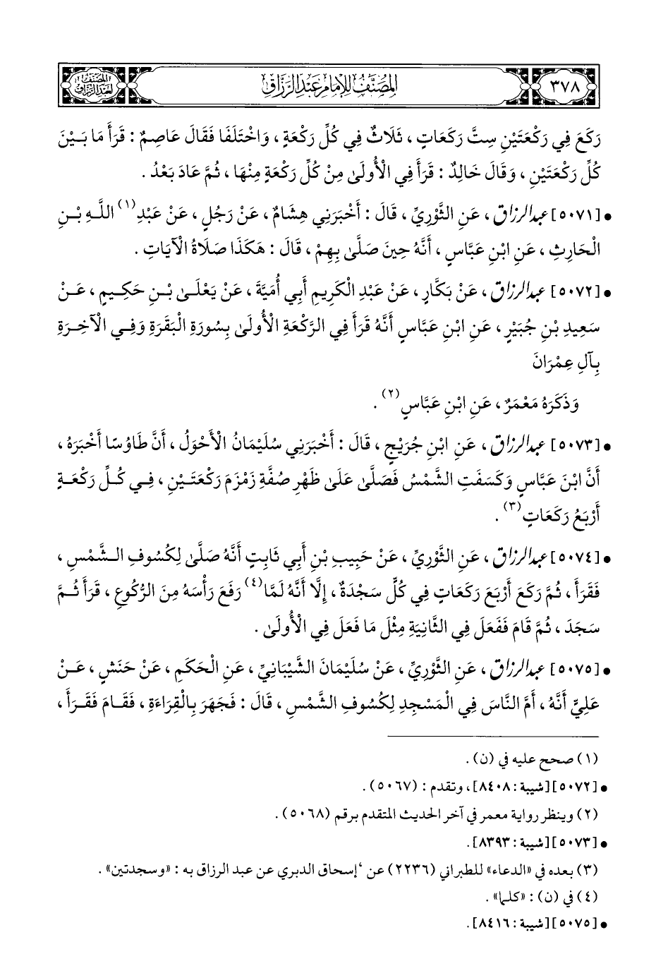 • [٥٠٧٣] عبد الرزاق، عَنِ ابْنِ جُرَيْجٍ، قَالَ: أَخْبَرَنِي سُلَيْمَانُ الْأَحْوَلُ، أَنَّ طَاوُسَا أَخْبَرَهُ، أَنَّ ابْنَ عَبَّاسٍ وَكَسَفَتِ الشَّمْسُ فَصَلَّى عَلَى ظَهْرِ صُفَّةِ زَمْزَمَ رَكْعَتَيْنِ، فِي كُلِّ رَكْعَةٍ أَرْبَعُ رَكَعَاتٍ (¬٣).
