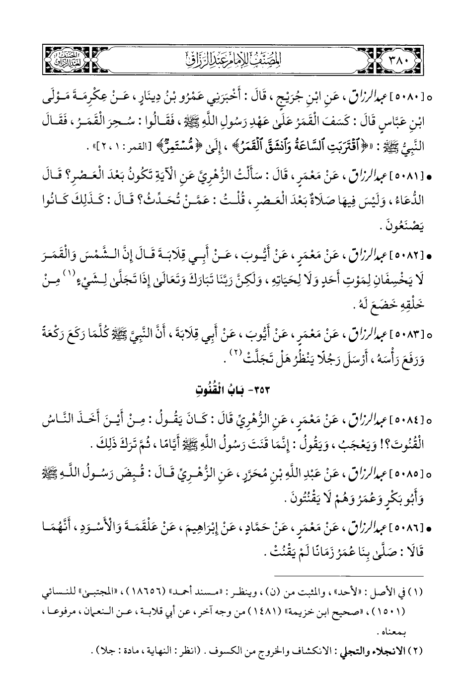 ° [٥٠٨٤] عبد الرزاق، عَنْ مَعْمَرٍ، عَنِ الزُّهْرِيِّ قَالَ: كَانَ يَقُولُ: مِنْ أَيْنَ أَخَذَ النَّاسُ الْقُنُوتَ؟! وَيَعْجَبُ، وَيَقُولُ: إِنَّمَا قَنَتَ رَسُولُ اللَّهِ - صلى الله عليه وسلم - أَيامًا، ثُمَّ تَرَكَ ذَلِكَ.