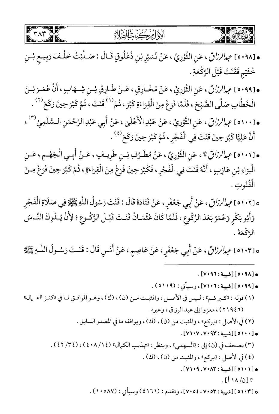 • [٥١٠٠] عبد الرزاق، عَنِ الثوْرِيِّ، عَنْ عَبْدِ الْأَعْلَى، عَنْ أَبِي عَبْدِ الرَّحْمَنِ السُّلَمِيِّ (¬٣)، أَنَّ عَلِيًّا كَبَّرَ حِينَ قَنَتَ فِي الْفَجْرِ، ثُمَّ كَبَّرَ حِينَ رَكَعَ (¬٤).