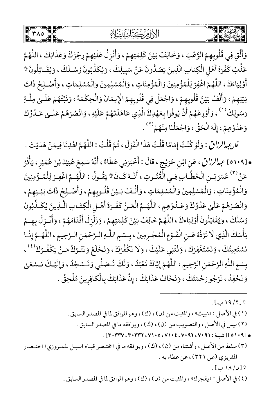 قال عبد الرزاق: وَلَوْ كُنْتُ إِمَامًا قُلْتُ هَذَا الْقَوْلَ، ثُمَّ قُلْتُ: اللَّهُمَّ اهْدِنَا فِيمَنْ هَدَيْتَ.